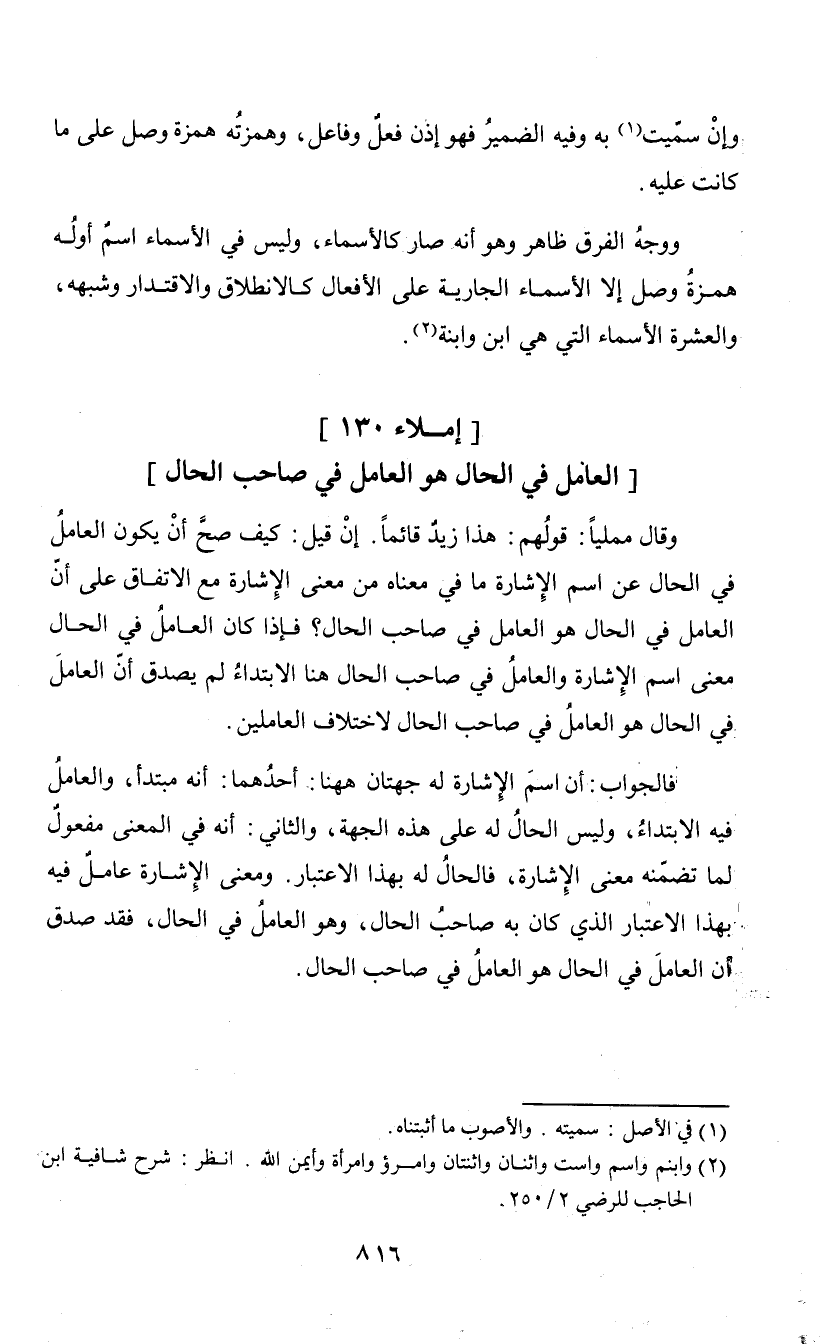 وقال ممليا: قولهم: هذا زيد قائما. إن قيل: كيف صح أن يكون العامل في الحال عن اسم الإشارة ما في معناه من معنى الإشارة مع الاتفاق على أن العامل في الحال هو العامل في صاحب الحال؟ فإذا كان العامل في الحال معنى اسم الإشارة والعامل في صاحب الحال هنا الابتداء لم يصدق أن العامل في الحال هو العامل في صاحب الحال لا ختلاف العاملين. فالجواب: أن اسم الإشارة له جهتان ههنا: أحدهما: أنه مبتدأ، والعامل فيه الابتداء، وليس الحال له على هذه الجهة، والثاني: أنه في المعنى مفعول لما تضمنه معنى الإشارة، فالحال له بهذ الاعتبار. ومعنى الإشارة عامل فيه بهذا الاعتبار الذي كان به صاحب الحال، وهو العامل في الحال، ققد صدق أن العامل في الحال هو العامل في صاحب الحال