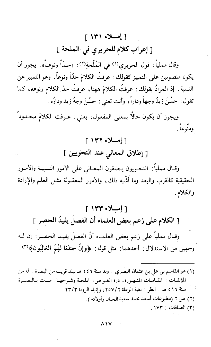 (¬1) هو القاسم بن علي بن عثمان البصري. ولد سنة 446هـ ببلد قريب من البصرة. له من المؤلفات: المقامات المشهورة، درة الغواص، الملحة وشرحها. مات بالبصرة سنة 516هـ. انظر: بغية الوعاة 2/ 257، وإنباه الرواة 3/ 23.