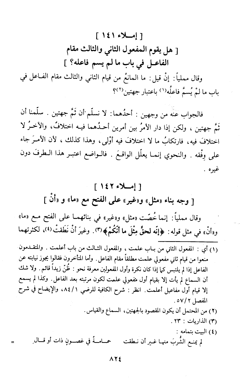 وقال ممليا: إن قيل: ما المانع من قيام الثاني والثالث مقام الفاعل في باب ما لم يسم فاعله (¬1) باعتبار جهتين (¬2). فالجواب عنه من وجهين: أحدهما: لا نسلم أن ثم جهتين. سلمنا أن ثم جهتين، ولكن إذا دار الأمر بين أمرين أحدهما فيه اختلاف، والآخر لا اختلافيه، فارتكاب ما لا اختلاف فيه أولى، وهذا كذلك، لأن الأمر جاء على وفقه. والنحوي إنما يعلل الواقع. فالواضع اعتبر هذا الطرف دون غيره.