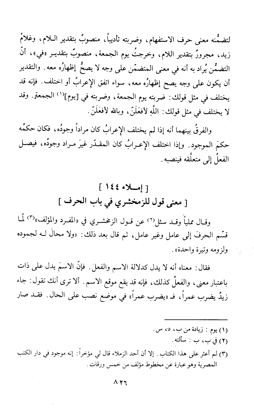 لتضمنه معنى حرف الاستفهام، وضربته تأديبا، منصوب بتقدير اللام، وغلام زيد، مجرور بتقدير اللام، وخرجت يوم الجمعة، منصوب بتقدير "في"، أن التتضمن يراد به أنه في معنى المتضمن على وجه لا يصح إظهاره معه. والتقدير أن يكون على وجه يصح إظهاره معه، سواء اتفق الإعراب أو اختلف. فإنه قد يختلف في مثل قولك: ضربها يوم الجمعة، وضربته في [يوم] (¬1) الجمعة. وقد لا يختلف في مثل قولك: الله لأفعلن، وبالله لأفعلن. والفرق بينهما أنه إذا لم يختلف الإعراب كان مرادا وجوده، فكان جكمه حكم الموجود. وإذا اختلف الإعراب كان مرادا وجوده، فكان حكمه حكم الموجود. وإذا اختلف الإعراب كان المقدر غير مراد وجوده، فيصل الفعل إلى متعلقه فينصبه.