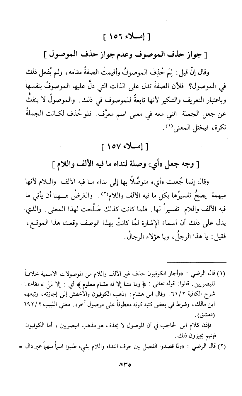 (¬1) قال الرضي: "وأجاز الكوفيون حذف غير الألف واللام من الموصولات الاسمية خلافا للبصريين. قالوا: قوله تعالى: {وما منا إلا له مقام معلوم} أي: إلا من له مقام". شرح الكافية 2/ 61. وقال ابن هشام: "ذهب الكوفيون والأخفش إلى إجازته، وتبعهم ابن مالك، وشرط في بعض كتبه كونه معطوفا على موصول آخر". منغي اللبيب 2/ 692 (دمشق) فإذن كلام ابن الحاجب في أن الموصول لا يحذف هو مذهب البصريين، أما الكوفيون فإنهم يجيزون ذلك.