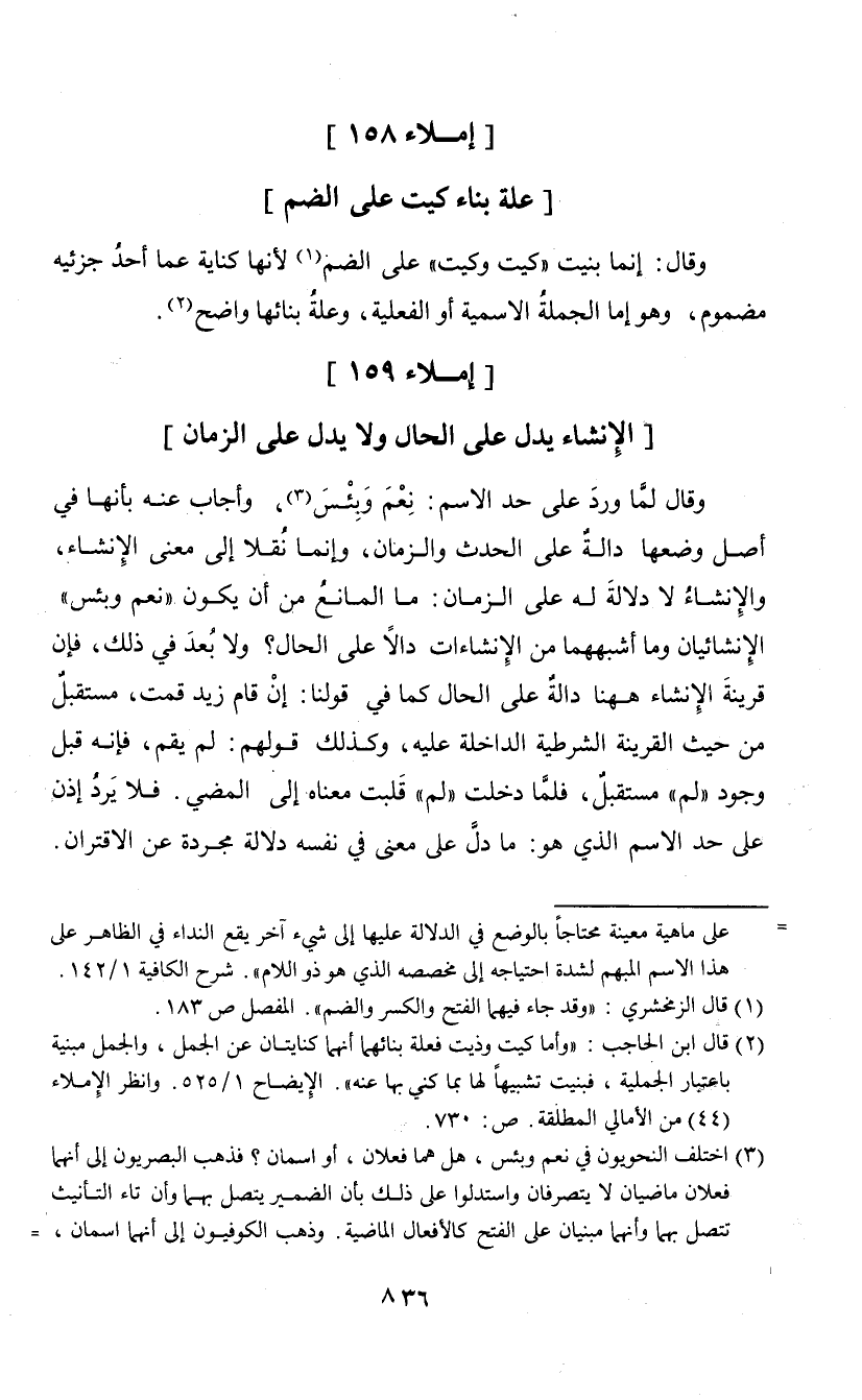 (¬2) قال ابن الحاجب: "وأما كيت وذيت فعلة بنائهما أنهما كنايتان عن الجمل، والجمل مبنية باعتبار الجملية، فنبت تشبيها لها بما كنى بها عنه". الإيضاح 1/ 525. واظر الإملاء (44) من الأمالي المطلقة. ص: 730.
