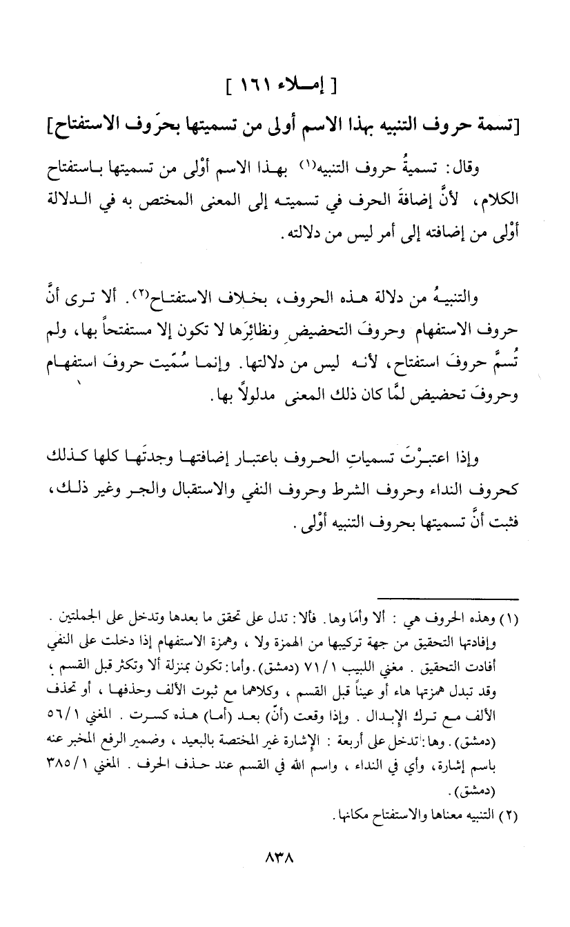 وقال: تسمية حروف التنبيه (¬1) بهذا للاسم أولى من تسميتها باستفتاح الكلام، لأن إضافة الحرف في تسميته إلى المعنى المختص به في الدلالة أولى من إضافته إلى أمر ليس من دلالته. والتنبيه من دلالة هذه الحروف، بخلاف الاستفتاح (¬2). ألا ترى أن حروف الاستفهام وحروف التحضيض ونظائرها لا تكون إلا مستفتحا بها، ولم تسم حروف استفتاح، لأنه ليس من دلالتها. وإنما سميت حروف استفهام وحروف تحضيض لما كان ذلك المعنى مدلولا بها. وإذا اعتبرت تسميات الحروف باعتبار إضافتها وجدتها كلها كذلك كحروف النداء وحروف الشرط وحروف النفي والاستقبال والجر وغير ذلك، فثبت أن تسميتها بحروف التنبيه أولى.