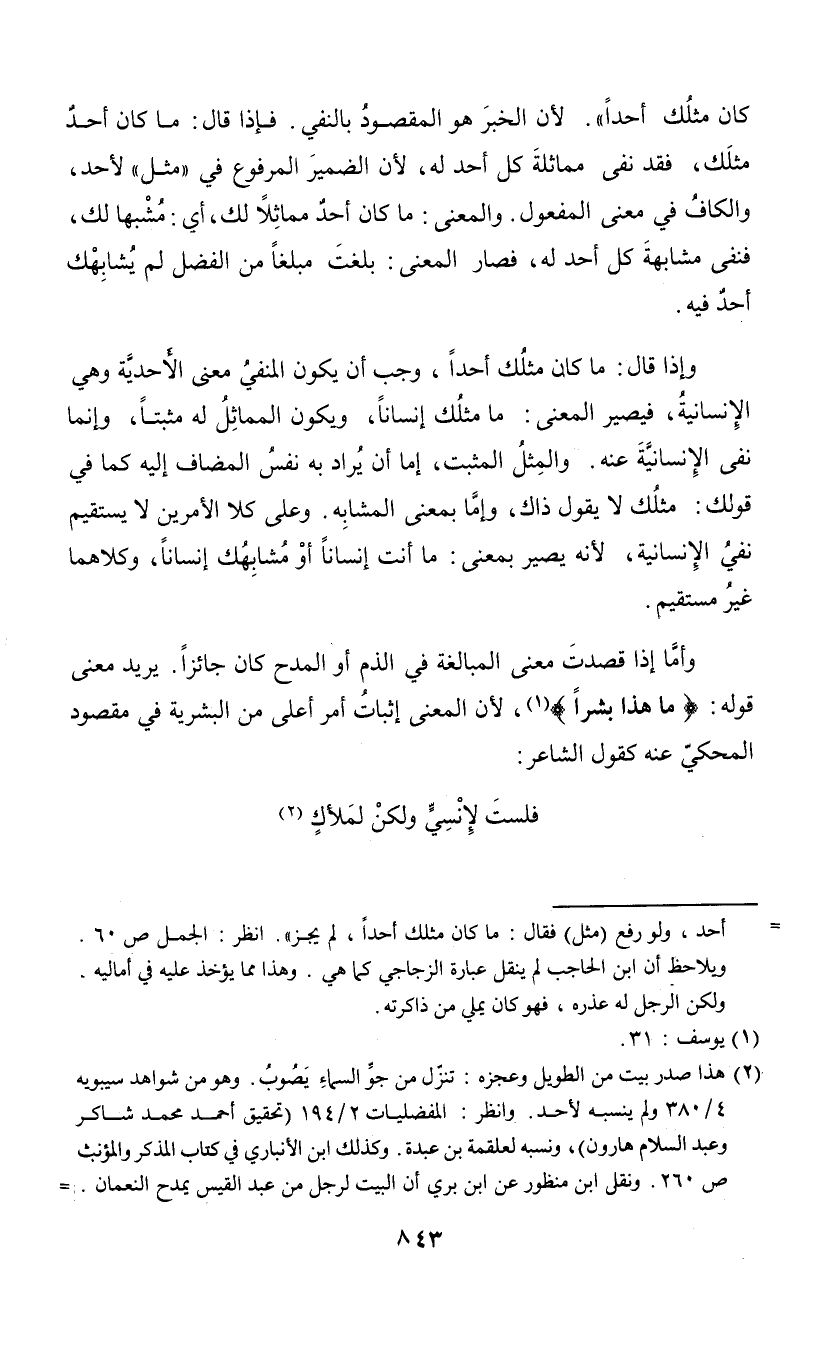 كان مثلك أحدا". لأن الخبر هو المقصود بالنفي. فإذا قال: ما كان أحد مثلك، فقد نفي مماثلة كل أحد له، لأن الضمير المرفوع في "مثل" لأحد، والكاف في معنى المفعول. والمعنى: ما كان أحد مماثلا لك، أي: مشبها لك، فنفى مشابهة كل أحد له، فصار المعنى: بلغت مبلغا من الفضل لم يشابهك أحد فيه. وإذا قال: ما كان مثلك أحدا، وجب أن يكون المنفي معنى الأحدية وهي الإنسانية، فيصير المعنى: ما مثلك إنسانا، ويكون المماثل له مثبتا، وإنما نفى الإنسانية عنه. والمثل المثبت، أما أن يراد به نفس المضاف إليه كما في قولك: مثلك لا يقول ذلك، وإما بمعنى المشابه. وعلى كلا الأمرين لا يستقيم نفي الإنسانية، لأنه يصير بمعنى: ما أنت إنسانا أو مشابهك إنسانا، وكلاهما غير مستقيم. وأما إذا قصدت معنى المبالغة في الذم أو المدح كان جائزا. يريد معنى قوله: {ما هذا بشرا} (¬1)، لأن المعنى إثبات أمر أعلى من البشرية في مقصود المحكي عنه كقول الشاعر: