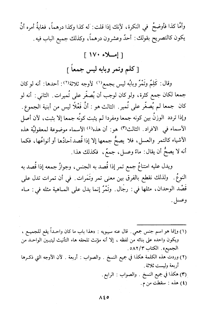 وقال: كلم وتمر وبابه ليس بجمع (¬1) لأوجه ثلاثة (¬2): أحدها: أنه لو كان جمعا لكان جمع كثرة، ولو كان لوجب أن يصغر على تميرات. الثاني: أنه لو كان جمعا لم يصغر على تمير. الثالث هو: أن فعلا ليس من أبية الجموع. وإذا تردد الوزن بين كونه جمعا ومفردا لم يثبت كونه جمعا إلا بثبت، لأن أصل الأسماء في الافراد. الثالث (¬3) هو: أن هذه (¬4) الأسماء موضوعة لمعقولية هذه الأشياء كالتمر والعسل، فلا يصح جمعها إلا إذا قصد آحادها أو أنواعها، فكما أنه لا يصح أن يقال: ماء وعسل، جمع، فكذلك هذا. ويدل عليه امتناع جمع تمر إذا قصد به الجنس، وجواز جمعه إذا قصد به النوع. ولذلك نقطع بالفرق بين معنى تمر وتمرات. في أن تمرات تدل على قصد الوحدان، مثلها في: رجال. وتمر إنما يدل على الماهية مثله في: ماء وعسل