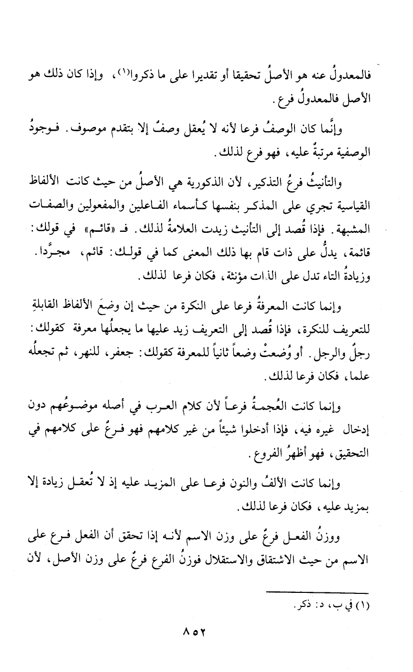 فالمعدول عنه هو الأصل تحقيقا أو تقديرا على ما ذكروا (¬1)، وإذا كان ذلك هو الأصل فالمعدول فرع. وإنما كان الوصف فرعا لأنه لا يعقل وصف إلا بتقدم موصوف. فوجود الوصفية مرتبة عليه، فهو فرع لذلك. والتأنيث فرع التذكير، لأن الذكورية هي الأصل من حيث كانت الألفاظ القياسة تجري على المذكر بفسها كأسماء القاعلين والمفعولين والصفات المشبهة. فإذا قصد إلى التأنيث زيدت العلامة لذلك. فـ "قائم" في قولك: قائمة، يدل على ذات قام بها ذلك المعنى كما في قولك: قائم، مجردا. وزيادة التاء تدل على الذات مؤنثة، فكان فرعا لذلك. وإنما كانت المعرفة فرعا على النكرة من حيث إن وضع الألفاظ القابلة للتعريف للنكرة، فإذا قصد إلى التعريف زيد عليها ما يجعلها معرفة كقولك: رجل والرجل. أو وضعت وضعا ثانيا للمعرفة كقولك: جعفر، للنهر، ثم تجعله علما. فكان فرعا لذلك. وإنما كانت العجمة فرعا لأن كلام العرب في أصله موضوعهم دون إدخال غيره فيه، فإذا أدخلوا شيئا من غير كلامهم فهو فرع على كلامهم في التحقيق، فهو أظهر الفروع. وإنما كانت الألف والنون فرعا على المزيد عليه إذ لا تعقل زيادة إلا بمزيد عليه، فكان فرعا لذلك. ووزن الفعل فرع على وزان الاسم لأنه إذا تحقق أن الفعل فرع على الاسم من حيث الاشتقاق والاستقلال فوزن الفرع فرع على وزن الأصل، لأن