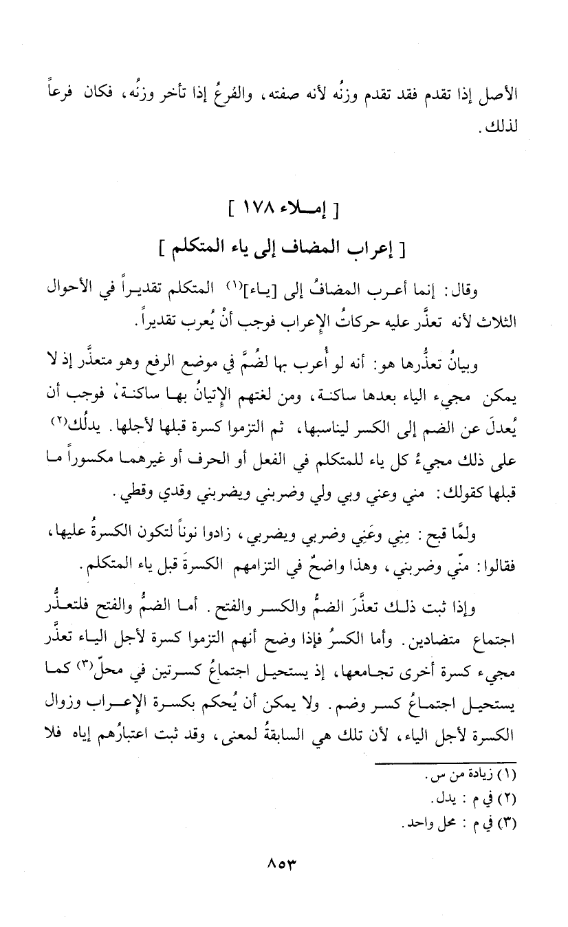 وقال: إنما أعرب المضاف إلى [ياء] (¬1) المتكلم تقديرا في الأحوال الثلاث لأنه تعذر عليه حركات الإعراب فوجب أن يعرب تقديرا. وبيان تعذرها هو: أنه لو أعرب بها لضم في موضع الرفع وهو متعذر إذ لا يكمن مجيء الياء بعدها ساكنة، ومن لغتهم الإتيان بها ساكنة، فوجب أن يعدل عن الضم إلى الكسر ليناسبها، ثم التزموا كسرة فبلها لأجلها. يدلك (¬2) على ذلك محيء كل ياء للمتكلم في الفعل أو الحرف أو غيرهما مكسورا ما قبلها كقولك: مني وعني وبي ولي وضربني وقدي وقطي. ولما قبح: مني وعني وضربي ويضربي، زادوا نونا لتكون الكسرة عليها، فقالوا: مني وضربني، وهذا واضح في التزامهم الكسرة قبل ياء المتكلم. وإذا ثبت ذلك تعذر الضم والكسر والفتح. أما الضم والفتح فلتعذر اجتماع متضادين. وأما الكسر فإذا وضح أنهم التزموا كسرة لأجل الياء تعذر مجيء كسرة أخرى تجامعها، إذ يستحيل اجتماع كسرتين في محل (¬3) كما سيتحيل اجتماع كسر وضم. ولا يمكن أن يحكم بكسرة الإعراب وزوال الكسرة لأجل الياء، لأن تلك هي السابقة لمعنى، وقد ثبت اعتبارهم إياه فلا