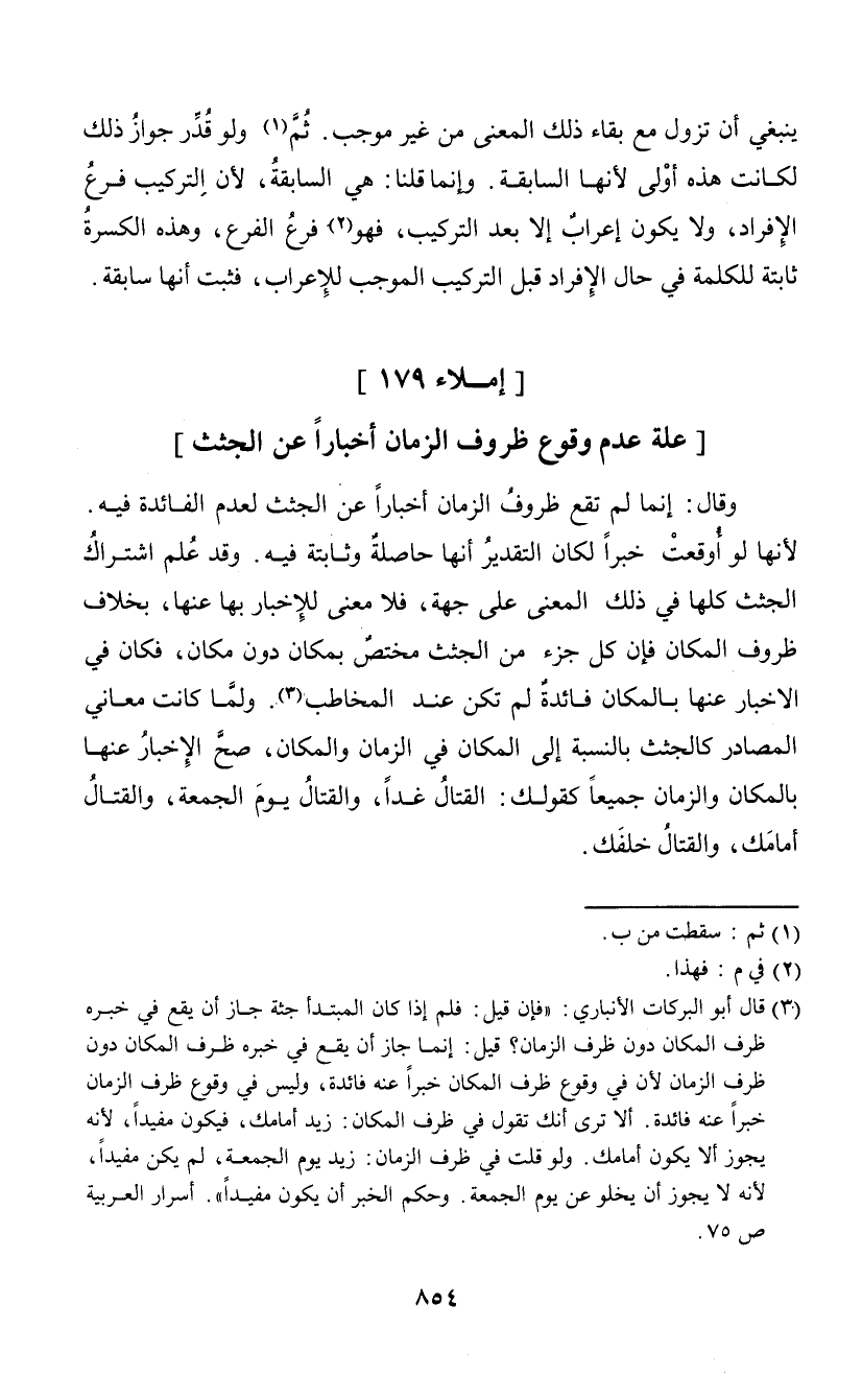 (¬3) قال أبو البركات الأنباري: "فإن قيل: فلم إذا كان المبتدأ جثة جاز أن يقع في خبره ظرف المكان دون ظرف الزمان؟ قيل: إنما جاز أن يقع في خبره ظرف المكان دون ظرف الزمان لأن في وقوع ظرف المكان خبرا عنه فائدة، وليس في وقوع ظرف الزمان خبرا عنه فائدة. ألا ترى أنك تقول في ظرف المكان: زيد أمامك، فيكون مفيدا، لأنه يجوز ألا يكون أمامك. ولو قلت في ظرف الزمان: زيد يوم الجمعة، لم يكن مفيدا، لأنه لا يجوز أن يخلو عن يوم الجمعة. وحكم الخبر أن يكون مفيدا" أسرار العربية ص 75.