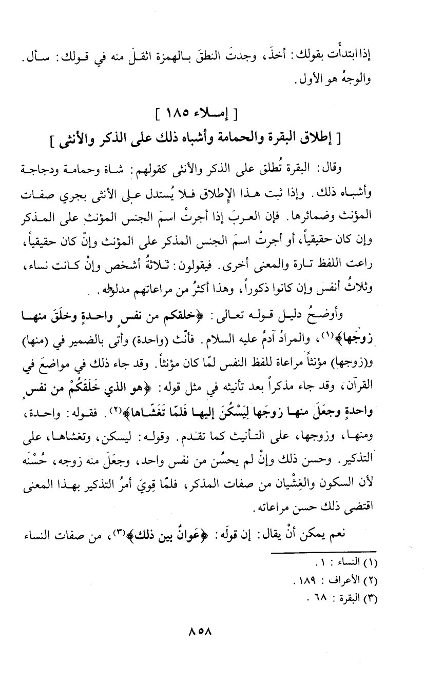 وقال: البقرة تطلق على الذكر والنثى كقولهم: شاة وحمامة ودجاجة وأشباه ذلك. إذا ثبت هذا الإطلاق فلا يستدل على الأنثى بجري صفات المؤنث وضمائرها. فإن العرب إذا أجرت اسم الجنس المؤنث على المذكر وإن كان حقيقيا، أو أجرت اسم الجنس المذكر على المؤنث وإن كان حقيقيا، راعت اللفظ تارة والمعنى أخرى. فيقولون: ثلاثة أشخص وإن كانت نساء، وثلاث أنفس وإن كانو ذكورا، وهذا أكثر من مراعاتهم مدلوله. وأوضح دليل قوله تعالى: {خلقكم من نفس واحدة وخلق منها زوجها} (¬1)، والمراد آدم عليه السلام. فأنث (واحدة) وأتى بالضمير في (منها) و (زوجها) مؤنثا مراعاة للفظ النفس لما كان مؤنثا. وقد جاء ذلك في مواضع في القرآن، وقد جاء مذكرا بعد تأنيثه في مثل قوله: {هو الذي خلقكم من نفس واحدة وجعل منها زوجها ليسكن إليها فلما تغشاها} (¬2). فقوله: واحدة، ومنها، وزوجها، على التأنيث كما تقدم. وقوله: ليسكن، وتغشاها، على التذكير. وحسن ذلك وإن لم يحسن من نفس واحد، وجعل منه زوجه، حسنه لأن السكون والغشيان من صفات المذكر، فلما قوي أمر التذكير بهذا المعنى اقتضى ذلك حسن مراعاته. نعم يمكن أن يقال: إن قوله: {عوان بين ذلك} (¬3)، ومن صفات النساء