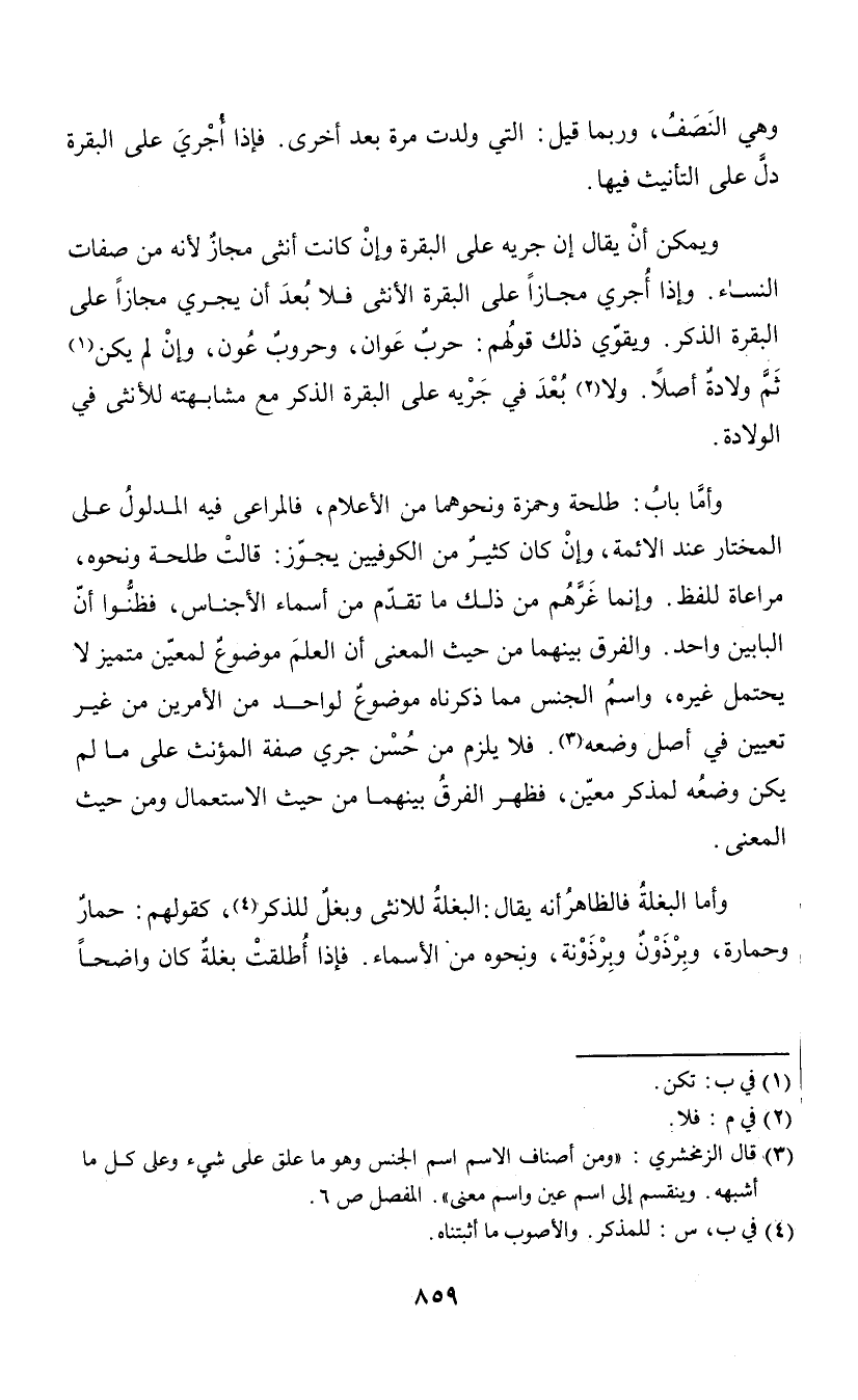 وهي النصف، وربما قيل: التي ولدت مرة بعد أخرى. فإذا أجري على البقرة دل على التأنيث فيها. ويمكن أن يقال إن جريه على البقرة وإن كانت أنثى مجاز لأنه من صفات النساء. وإذا أجري مجازا على البقرة الأنثى فلا بعد أن يجري مجازا على البقرة الذكر. ويقوي ذلك قولهم: حرب عوان، وحروب عون، وإن لم يكن (¬1) ثم ولادة أصلا. ولا (¬2) بعد في جريه على البقرة الذكر مع مشابهته للأنثى في الولادة. وأما باب: طلحة وحمزة ونحوهما من الأعلام، فالمراعى فيه المدلول على المختار عند الائمة، وإن كان كثير من الكوفيين يجوز: قالت طلحة ونحوه، مراعاة للفظ. وإنما غرهم من ذلك ما تقدم من أسماء الأجناس، فظنوا أن البابين واحد. والفرق بينهما من حيث المعنى أن العلم موضوع لمعين متميز لا يحتمل غيره، واسم الجنس مماذكرناه موضوع لواحد من الأمرين من غير تعيين في أصل وضعه (¬3). فلا يلزم من حسن جري صفة المؤنث على ما لم يكن وضعه لمذكر معين، فظهر الفرق بينهما من حيث الاستعمال ومن حيث المعنى. وأما البغلة فالظاهر أنه يقال: البغلة للانثى وبغل للذكر (¬4)، كقولهم: حمار وجمارة، وبرذون وبرذونه، ونحوه من الأسماء. فإذا أطلقت بغلة كان واضحا