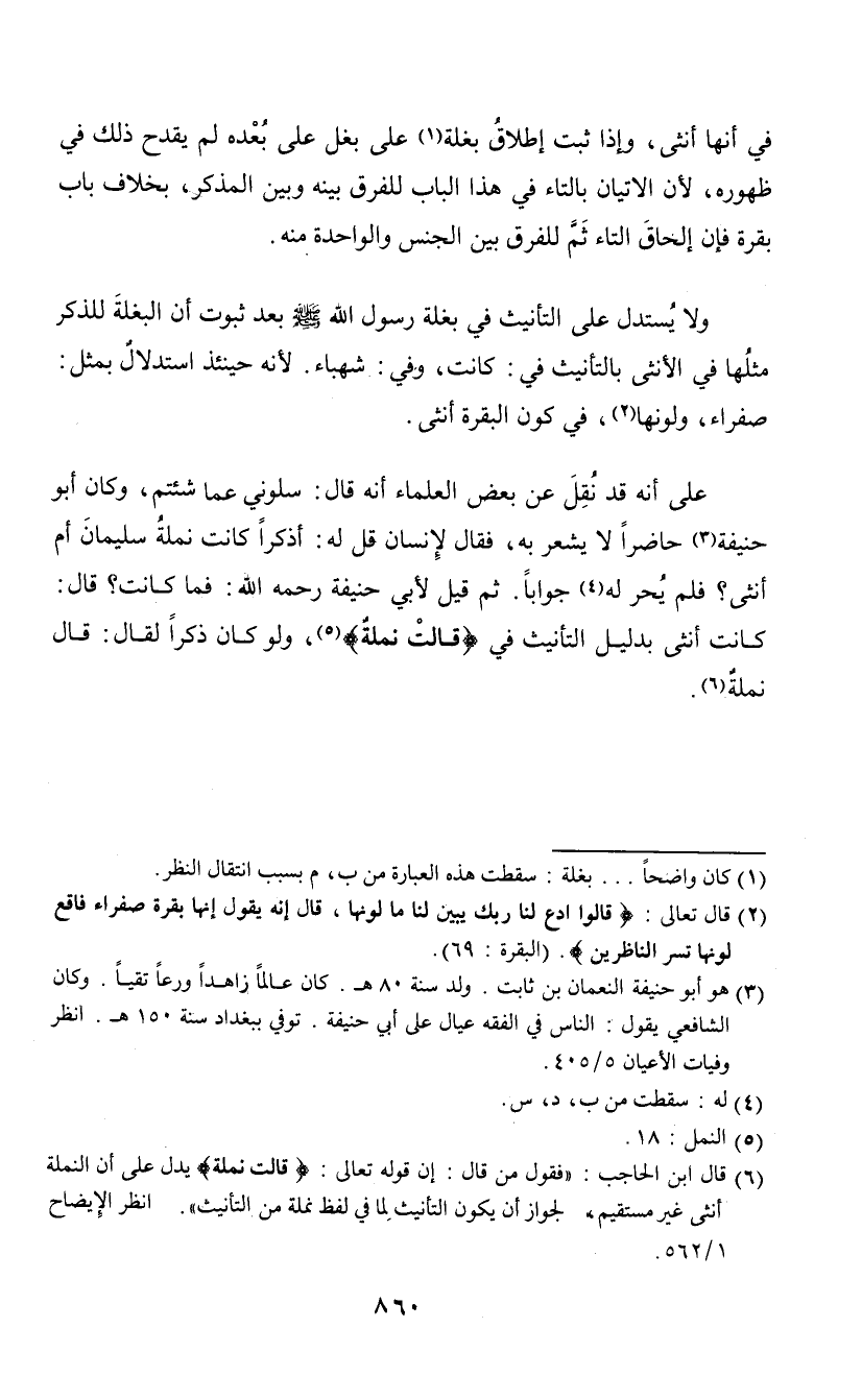 في أنها أنثى، وإذا ثبت إطلاق بغلة (¬1) على بغل على بعده لم يقدح ذلك في ظهوره، لأن الاتيان بالتاء في هذا الباب للفرق بينه وبين المذكر، بخلاف باب بقرة فإن إلحاق التاء ثم للفرق بين الجنس والواحدة منه. ولا يستدل على التأنيث في بغلة رسول الله - صلى الله عليه وسلم - بعد ثبوت أن البغلة للذكر مثلها في الأنثى بالتأنيث في: كانت، وفي: شهباء. لأنه حينئذ استدلال بمثل: صفراء، ولونها (¬2)، في كون البقرة أنثى. على أنه قد نقل عن بعض العلماء أنه قال: سلوني عما شئتم، وكان أبو حنيفة (¬3) حاضرا لا يشعر به، فقال لإنسان قل له: أذكرا كانت نملة سليمان أم أنثى؟ فلم يحر له (¬4) جوابا ثم قيل لأبي حنيفة رحمه الله: فما كانت؟ قال: كانت أنثى بدليل التأنيث في {قالت نملة} (¬5)، ولو كان ذكرا لقال: قال نملة (¬6).