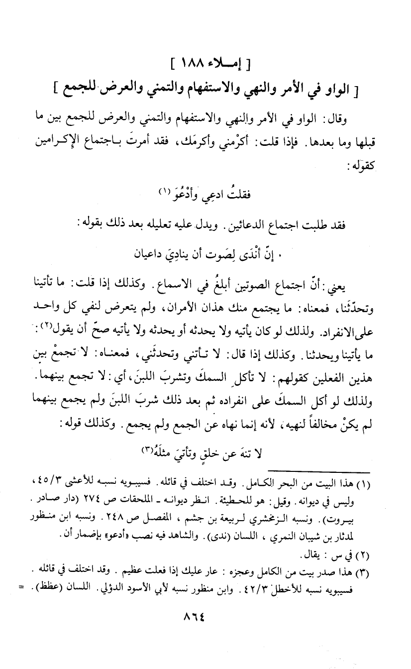 وقال: الواو في الأمر والنهي والاستفهام والتمني والعرض للجمع بين ما قبلها وما بعدها. فإذا قلت: أكرمني وأكرمك، فقد أمرت باجتماع الإكرامين كقوله: