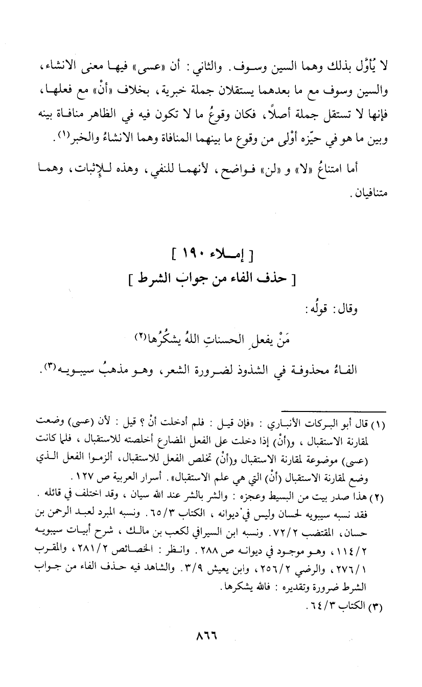(¬2) هذا صدر بيت من البسيط وعجزه: والشر بالشر عند الله سيان، وقد اختلف في قائله. فقد نسبه سيبويه لحسان وليس في ديوانه، الكتاب 3/ 65. ونسبه المبرد لعبد الرحمن بن حسان، المقتضب 2/ 72. ونسبه ابن السيرافي لكعب بن مالك، شرح أبيات سيبويه 2/ 114، وهو موجود في ديوانه ص 288. وانظر: الخصائص 2/ 281، والمقرب 1/ 276، والرضي 2/ 256، وابن يعيش 9/ 3. والشاهد فيه حذف الفاء من جواب الشرط ضرورة وتقديره: فالله يشكرها.
