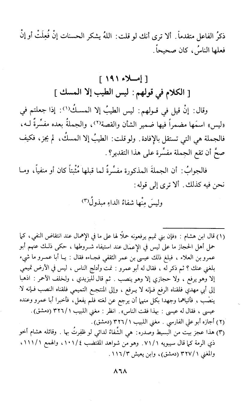 وقال: إن قيل في قولهم: ليس الطيب إلا المسك (¬1): إذا جعلتم في "ليس" اسمها مضمرا فيها ضمير الشأن والقصة (¬2)، والجملة بعده مفسرة له، فالجملة هي التي تستقل بالإفادة. ولو قلت: الطيب إلا المسك، لم يجز، فكيف صح أن تقع الجملة مفسرة على هذا التقدير؟. فالجواب: أن الجملة المذكورة مفسرة لما قبلها مثبتا كان أو منفيا، وما نحن فيه كذلك. ألا ترى إلى قوله: