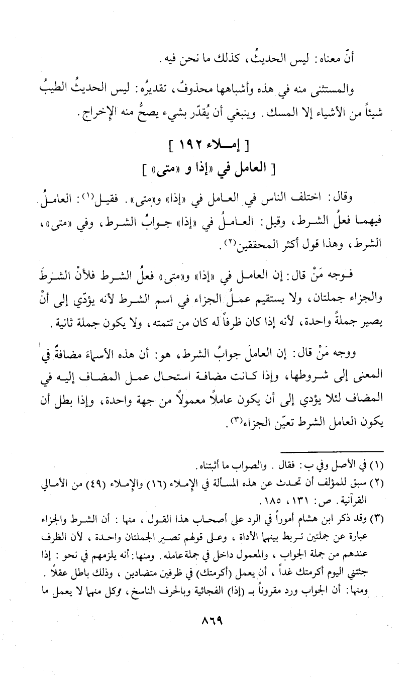 (¬3) وقد ذكر ابن هشام أمورا في الرد على أصحاب هذا القول، منها: أن الشرط والجزاء عبارة عن جملتين تربط بينهما الأداة، وعلى قولهم تصير الجملتان واحدة، لأن الظرف عندهم من جملة الجواب، والمعمول داخل في جملة عامله. ومنها: أنه يلزمهم في نحو: إذا جئتني اليوم أكرمتك غدا، أن يعمل (أكرمتك) في ظرفين متضادين، وذلك باطل عقلا. ومنها: أن الجواب ورد مقرونا بـ (إذا) الفجائية وبالحرف الناسخ، وكل منهما لا يعمل ما بعده فيما قبله، نحو: إذا جئتني اليوم فإني أكرمك. انظر مغني اللبيب 1/ 101 (دمشق).