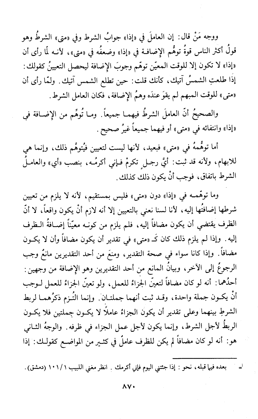 ووجه من قال: إن العامل في "إذا" جواب الشرط وفي "متى" الشرط وهو قول أكثر الناس قوة توهم الإضافة في "إذا" وضعفه في "متى"، لأنه لما رأى أن "إذا" لا تكون إلا للوقت المعين توهم وجوب الإضافة ليحصل التعيين كقولك: إذا طلعت الشمس آتيك، كأنك قلت: حين تطلع الشمس آتيك. ولما رأى أن "متى" للوقت المبهم لم يقو عنده وهم الإضافة، فكان العامل الشرط. والصحيح أن العامل الشرط فيهما جميعا. وما توهم من الإضافة في "إذا" وانتفائه في "متى" أو فيهما جميعا غير صحيح. أما توهمه في "متى" فبعيد، لأنها ليست لتعيين فيتوهم ذلك، وإنما هي للابهام، ولأنه قد ثبت: أي رجل تكرم فإني أكرمه، بنصب "أي" والعامل الشرط باتفاق، فوجب أن يكون ذلك كذلك. وما توهمه في "إذا" دون "متى" فليس بمستقيم، لأنه لا يلزم من تعيين شرطها إضافتها إليه، لأنا لسنا نعنى بالتعيين إلا أنه لازم أن يكون واقعا، لا أن الظرف يقتضي أن يكون مضافا إليه، فلم يلزم من كونه معينا إضافة الظرف إليه. وإذا لم يلزم ذلك كان كـ "متى" في تقدير أن يكون مضافا وأن لا يكون مضافا. وإذا كانا سواء في صحة التقدير، ومنع من أحد التقديرين مانع وجب الرجوع إلى الآخر، وبيان المانع من أحد التقديرين وهو الإضافة من وجهين: أحدهما: أنه لو كان مضافا لتعين الجزاء للعمل، ولو تعين الجزاء للعمل لوجب أن يكون جملة واحدة، وقد ثبت أنهما جملتان. وإنما التزم ذكرهما لربط الشرط بينهما وعلى تقدير أن يكون الجزاء عاملا لا يكون جملتين فلا يكون الربط لأجل الشرط، وإنما يكون لأجل عمل الجزاء في ظرفه. والوجه الثاني هو: أنه لو كان مضافا لم يكن للظرف عامل في كثير من المواضع كقولك: إذا