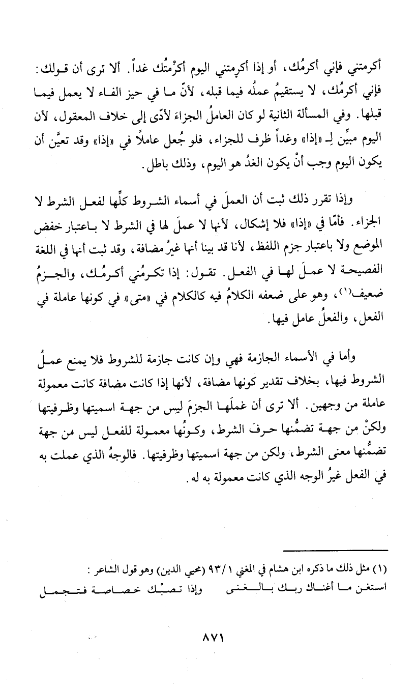 أكرمتني فإني أكرمك، أو إذا أكرمتني اليوم أكرمتك غدا. ألا ترى أن قولك: فإني أكرمك، لا يستقيم عمله فيما قبله، لأن ما في حيز الفاء لا يعمل فيما قبلها. وفي المسألة الثانية لو كان العامل الجزاء لأدى إلى خلاف المعقول، لأن اليوم مبين لـ "إذا" وغدا ظرف للجزاء، فلو جعل عاملا في "إذا" وقد تعين أن يكون اليوم وجب أن يكون الغذ هو اليوم، وذلك باطل. وإذا تقرر ذلك ثبت أن العمل في أسماء الشروط كلها لفعل الشرط لا الجزاء. فأما في "إذا" فلا إشكال، لأنها لا عمل لها في الشرط لا باعتبار خفض الموضع ولا باعتبار جزم اللفظ، لأنا قد بينا أنها غير مضافة، وقد ثبت أنها في اللغة الفصيحة لا عمل لها في الفعل. تقول: إذا تكرمني أكرمك، والجزم ضعيف (¬1)، وهو على ضعفه الكلام فيه كالكلام في "متى" في كونها عاملة في الفعل، والفعل عامل فيها. وأما في الأسماء الجازمة فهي وإن كانت جازمه للشروط فلا يمنع عمل الشروط فيها، بخلاف تقدير كونها مضافة، لأنها إذا كانت مضافة كانت معمولة عاملة من وجهين. ألا ترى أن عملها الجزم ليس من جهة اسميتها وظرفيتها ولكن من جهة تضمنها حرف الشرط، وكونها معمولة للفعل ليس من جهة تضمنها معنى الشرط، ولكن من جهة اسميتها وظرفيتها. فالوجه الذي عملت به في الفعل غير الوجه الذي كانت معمولة به له.
