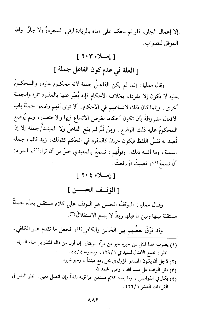 وقال ممليا: الوقف الحسن هو الوقف على كلام مستقل بعده جملة مستقلة بينها وبين ما قبلها ربط لا يمنع الا ستقلال (¬3). وقد فرق بعضهم بين الحسن والكافي (¬4)، فجعل ما تقديم هو الكافي،