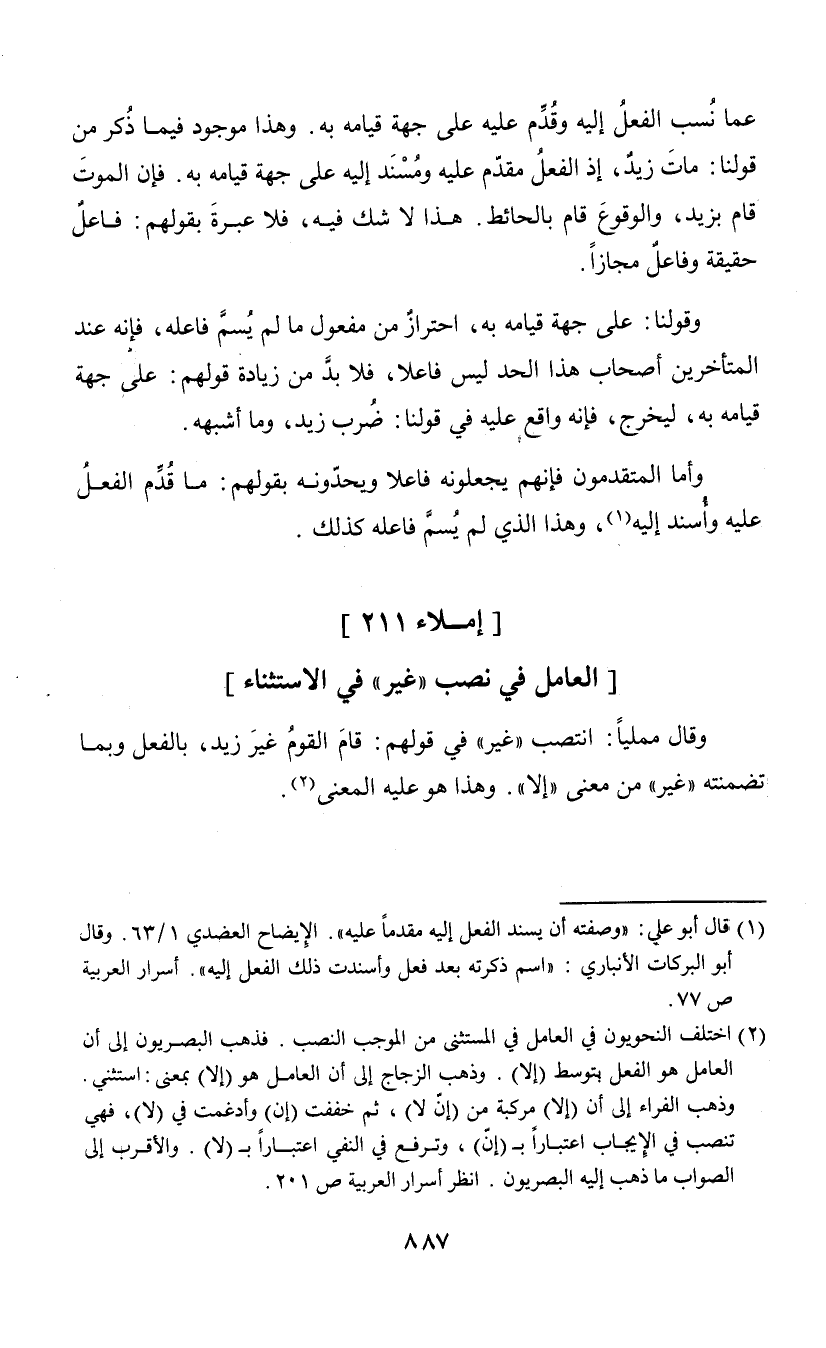(¬2) اختلف النحويون في العامل في المستثنى من الموجب النصب. فذهب البصريون إلى أن العامل هو الفعل بتوسك (إلا). وذهب الزجاج إلى أن العامل هو (إلا) بمعنى: استثني وذهب الفراء إلى أن (إلا) مركبة من (إن لا)، ثم خففت (إن) وأدغمت في (لا)، فهي تنصب في الإيجاب اعتبارا بـ (إن)، وترفع في النفي اعتبارا بـ (لا). والأقرب إلى الصواب ما ذهب إليه البصريون. انظر أسرار العربية ص 201.