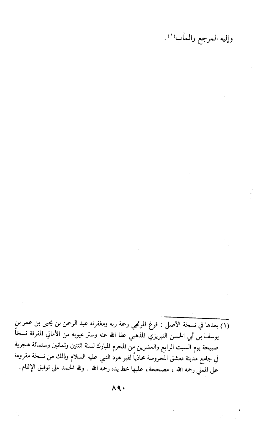 (¬1) بعدها في نسخة الأصل: فرغ المرتجي رحمة ربه ومغفرته عبد الرحمن بن يحيى بن عمر بن يوسف بن أبي الحسن التبريزي المذهبي عفا الله عنه وستر عيوبه من الأمالي المفرقة نسخا صبيحة يوم السبت الرابع والعشرين من المحرم المبارك لسنة اثنتين وثمانين وستمائة هجرية في جامع مدينة دمشق المحروسة محاذيا لقبر هود النبي عليه السلام وذلك من نسخة مقروءة على المملي رحمه الله، مصححة، عليها خط يده رحمه الله. ولله الحمد على توفيق الإتمام.