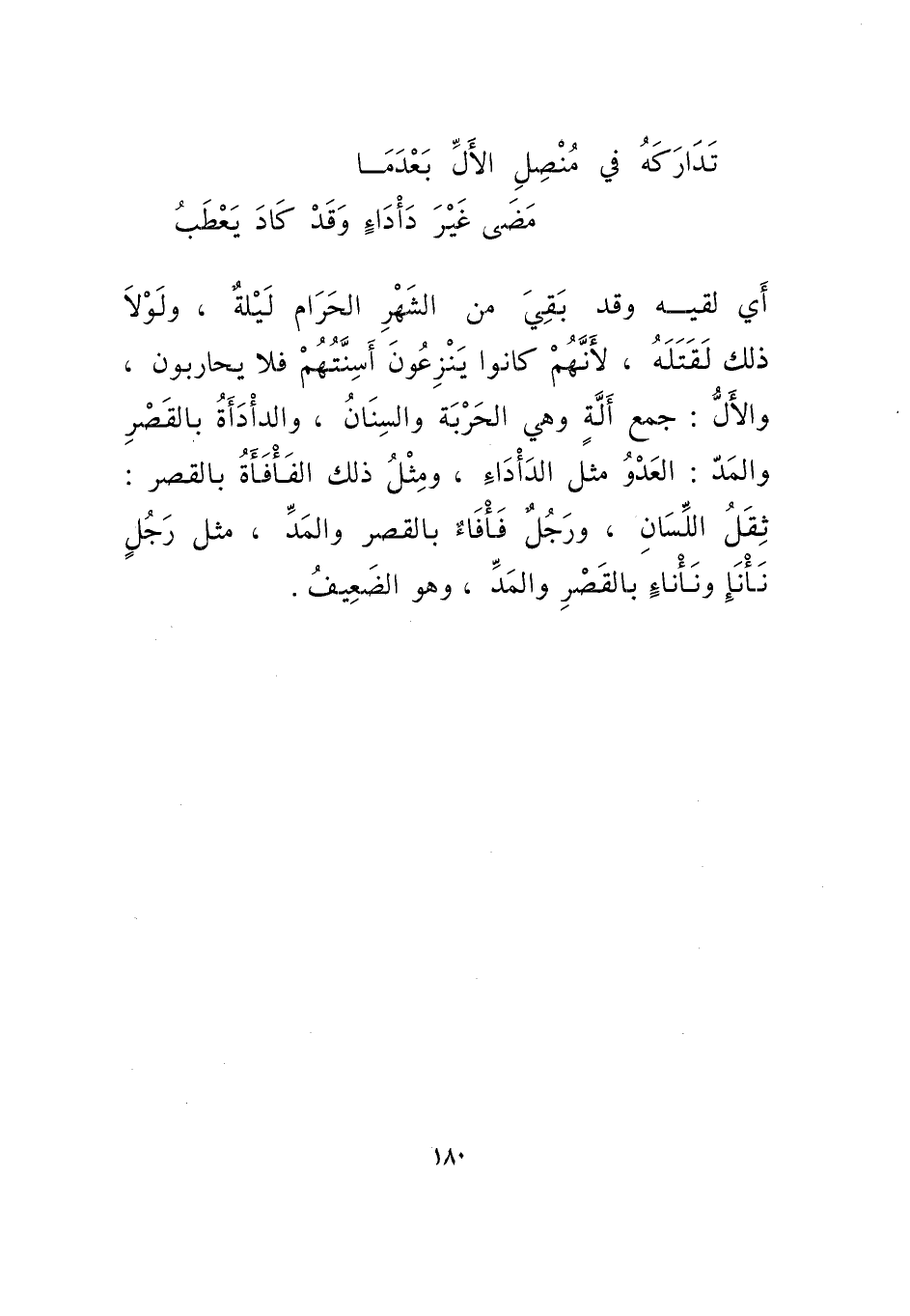 أي لقيه وقد بقي من الشهر الحرام ليلة، ولولا ذلك لقتله، لأنهم كانوا ينزعون أسنتهم فلا يحاربون، والأل: جمع ألَّة وهي الحربة والسنان، والدأدأة بالقصر والمد: العدو مثل الدأداء، ومثل ذلك الفأفأة بالقصر: ثقل اللسان، ورجل فأفاء بالقصر والمد، مثل رجل نأنإ ونأناء بالقصر والمد، وهو الضعيف.