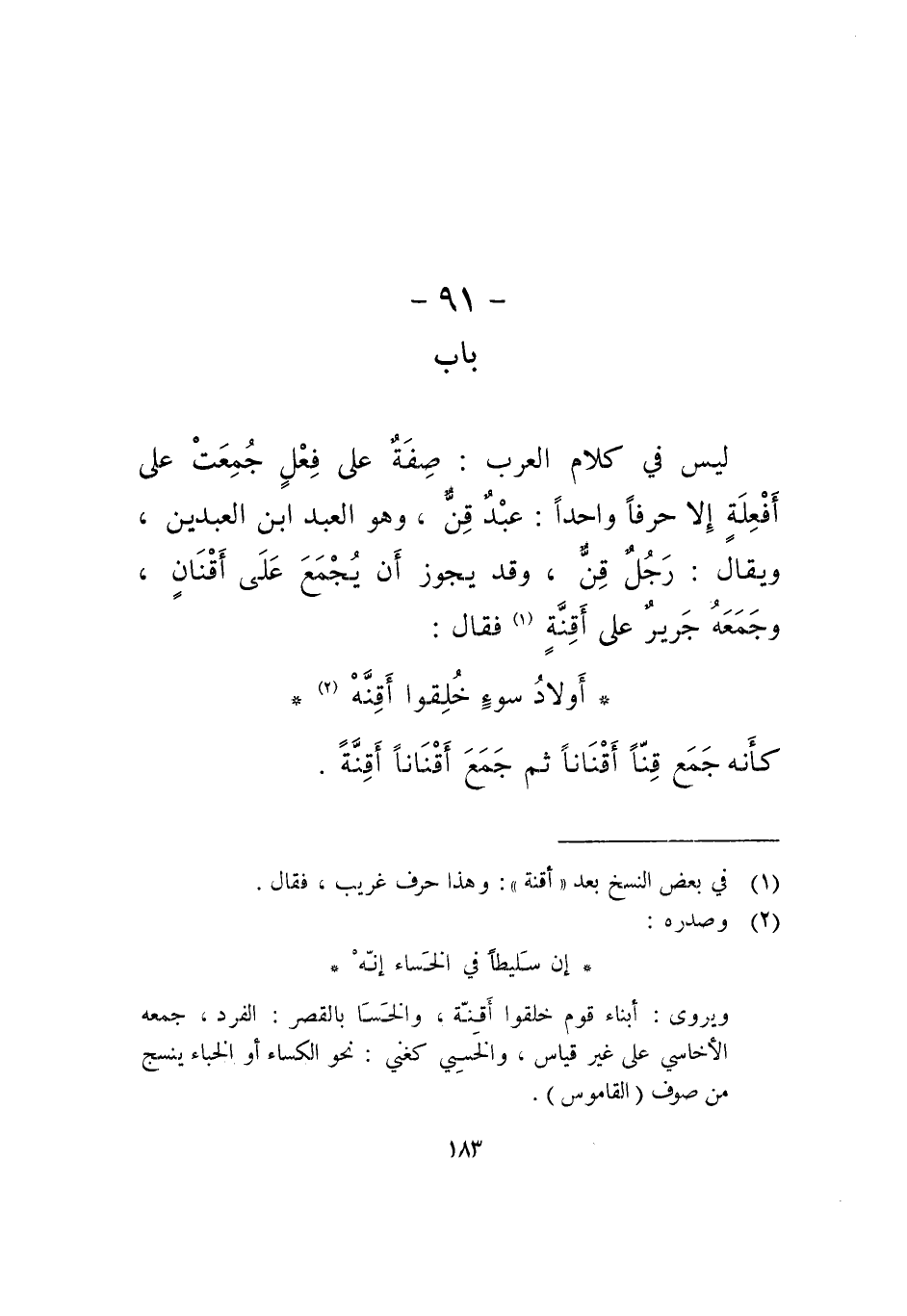 ليس في كلام العرب: صفة على فعل جمعت على أفعلة إلا حرفا واحدا: عبد قن، وهو العبد ابن العبدين، ويقال: رجل قِن، وقد يجوز أن يجمع على أقنان، وجمعه جرير على أقنة فقال: