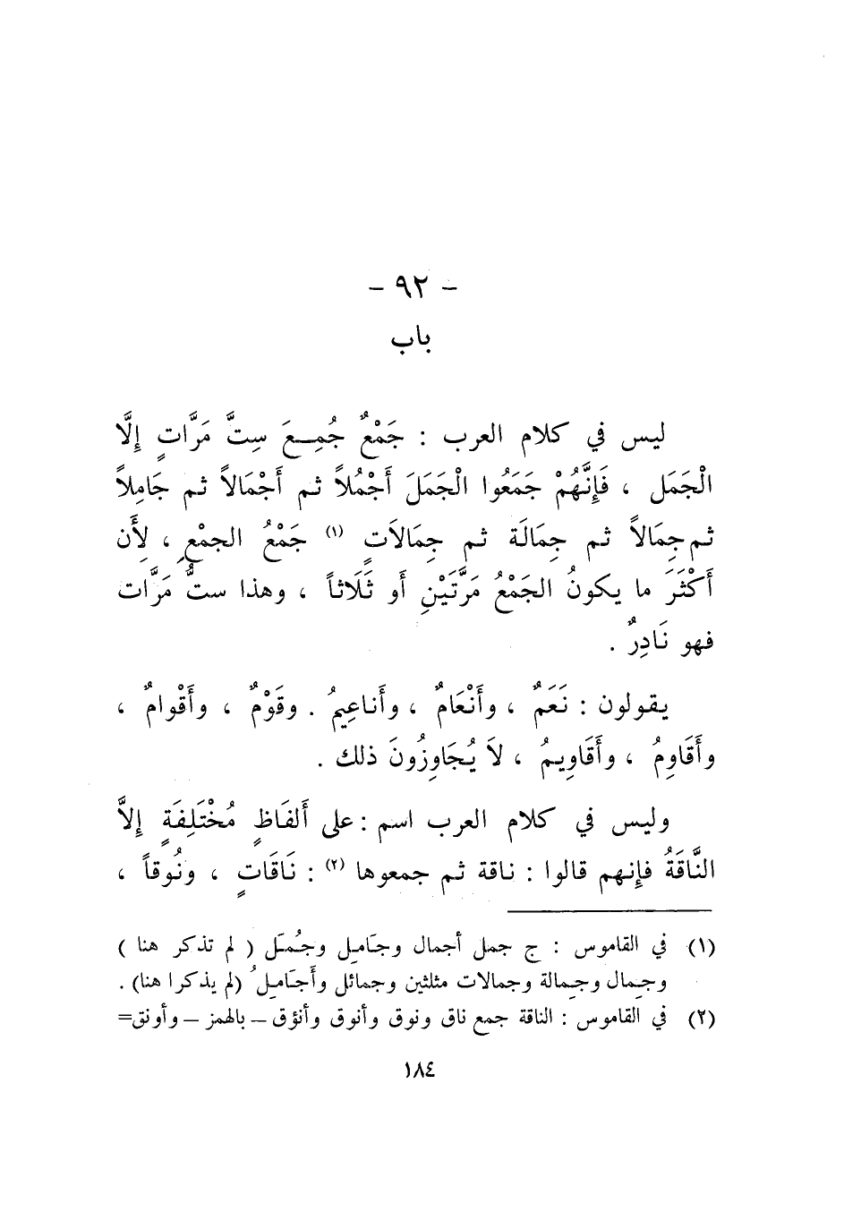 وليس في كلام العرب اسم: على ألفاظ مختلفة إلا الناقة فإنهم قالوا: ناقة ثم جمعوها: ناقات، ونوقا،