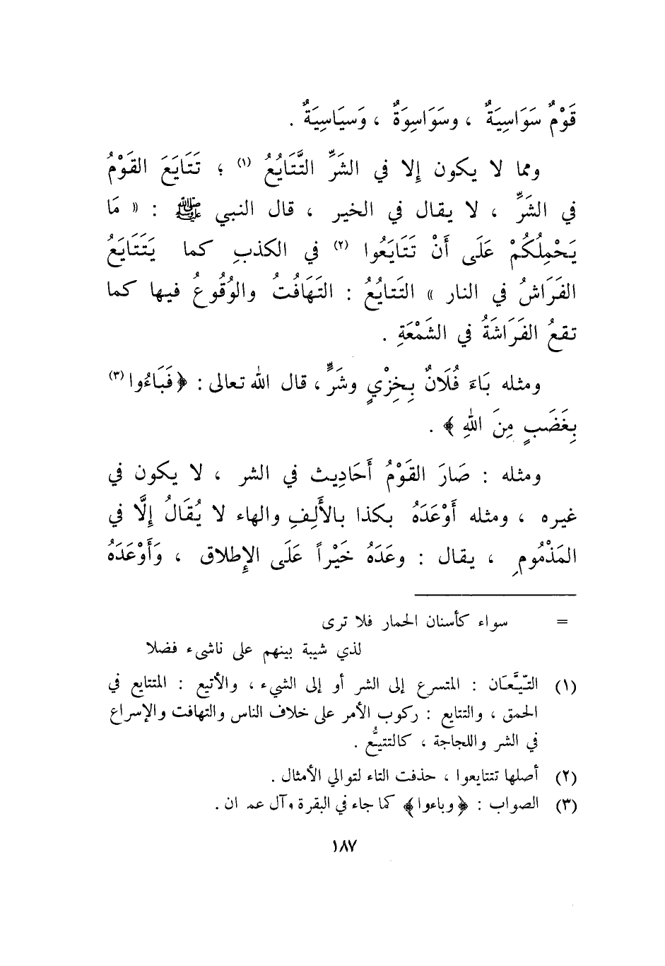 ومما لا يكون إلا في الشر التتابع، تتابع القوم في الشر، لا يقال في الخير، قال النبي صلى الله عليه وسلم: ما يحملكم على أن تتايعوا في الكذب كام يتتايع الفراش في النار) التتايع: التهافت والوقوع فيها كما تقع الفراشة في الشمعة.