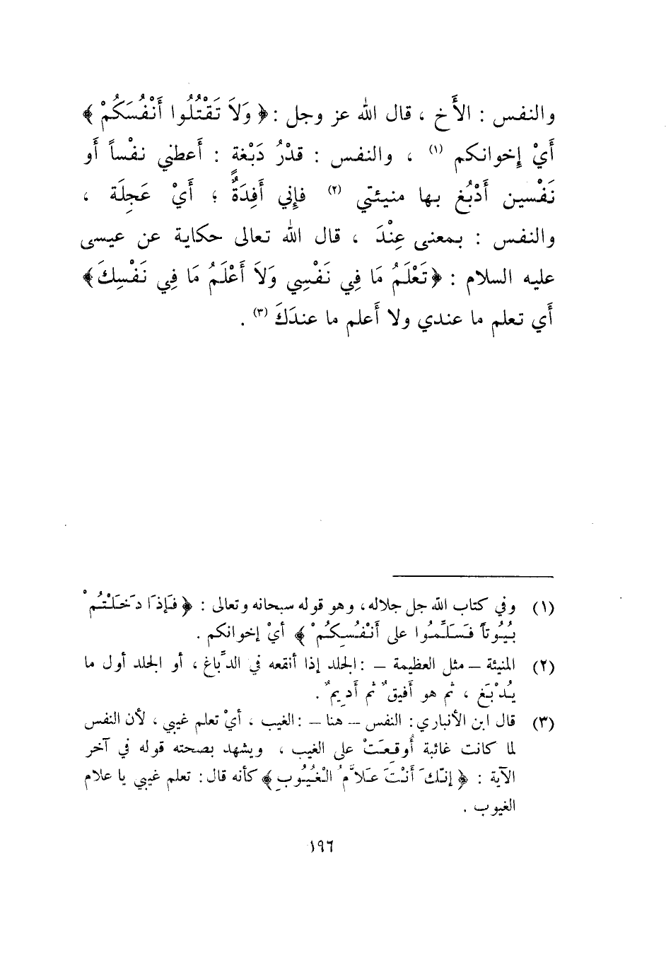 والنفسُ: الأخ، قال الله عز وجل: (ولا تقتلوا أنفسكم) أي إخوانكم، والنفس: قدر دبغة: أعطني نفسا أو نفسين أدبغ بها منيئتي فإني أفدَةٌ، أي عجلة، والنفس: بمعنى عند، قال الله تعالى حكاية عن عيسى عليه السلام: (وتعلم ما في نفسي ولا أعلم ما في نفسك) أي تعلم ما عندي ولا أعلم ما عندك.