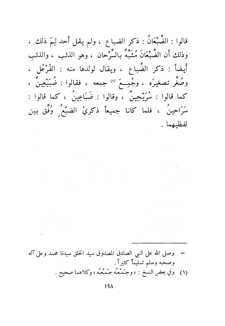 قالوا: الضبعان: ذكر الضباع، ولم يقل أحد لم ذلك، وذلك أن الضبعان مشبه بالسرحان، وهو الذئب، والذئب، أيضا: ذكر الضباع، ويقال لوالدها منه: الفرعل، وصغر تصغيره، وجمع جمعه، فقالوا: ضبيعين، كما قالوا: سريحين، وقالوا: ضباعين، كما قالوا: سراحين، فلما كانا جميعا ذكري الضبع وفق بين لفظيهما.