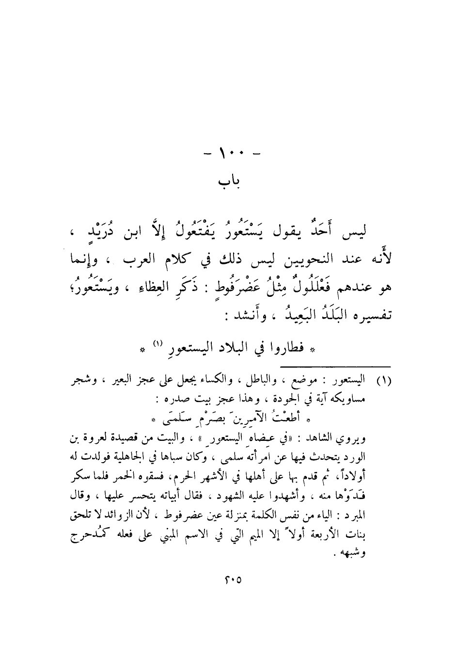 ليس أحد يقول يستعور يفتعول إلا ابن دريد، لأنه عند النحويين ليس ذلك في كلام العرب، وإنما هو عندهم فعللول مثل عضوفوط: ذكر العظاء، ويستعور، تفسيره البلد البعيد، وأنشد: