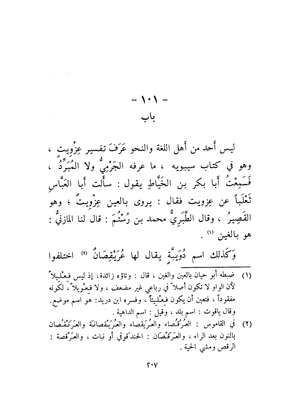 ليس أحد من أهل اللغة والنحو عرف تفسير عِزويت، وهو في كتاب سيبويه، ما عرفه الجَرمي ولا المبرد، فسمعت أبا بكر بن الخياط يقول: سألت أبا العباس ثعلبا عن عزويت فقال: يروى بالعين عزويت، وهو القصير، وقال الطبري محمد بن رستم: قال لنا المازني: هو بالغين.