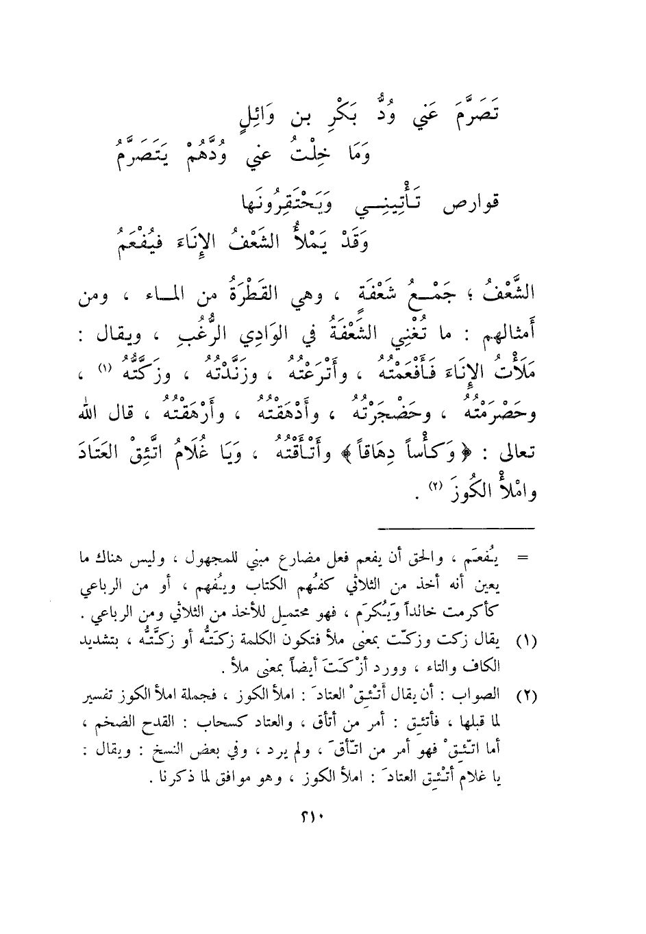 الشعف؛ جمع شعفة، وهي القطرة من الماء، ومن أمثالهم: ما تغني الشعفة في الوادي الرغب، ويقال: ملأت الإناء فأفعمته، وأترعته، وزندته، وزكته، وحصرمته، وحضجرته، وأدهقته، وأرهقته، قال الله تعالى: (وكأسا دهاقا) وأتأقته، ويا غلام اتئق العتاد واملأ الكوز.