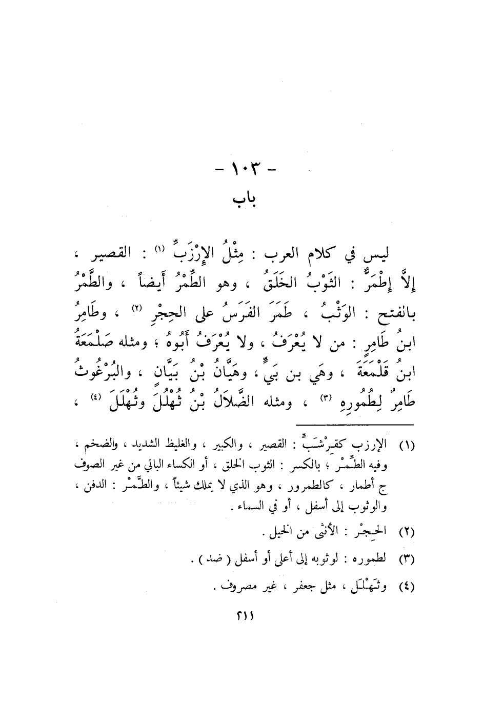 ليس في كلام العرب: مثل الإرزب: القصير، إلا إطمر: الثوب الخلق، وهو الطمر أيضا، والطمر بالفتح: الوثب، طمر الفرس على الحجر، وطامر ابن طامر: من لا يعرف، ولا يعرف أبوه، ومثله صلمعة ابن قلمعة، وهي بن بي، وهيان بن بيان، والبرغوث طامر لطموره، ومثله الضلال بن ثُهلُل وثُهلَل،