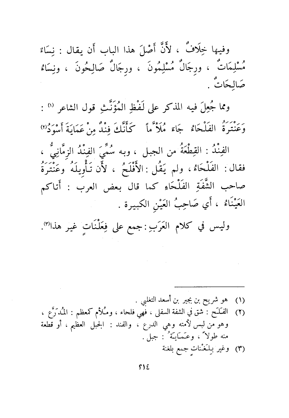 الفند: القطعة من الجبل، وبه سمي الفند الزماني، فقال: الفلحاء، ولم يقل: الأفلح، لأن تأويله وعنترة صاحب الشفة الفلحاء كما قال بعض العرب: أتاكم العيناء، أي صاحب العين الكبيرة.