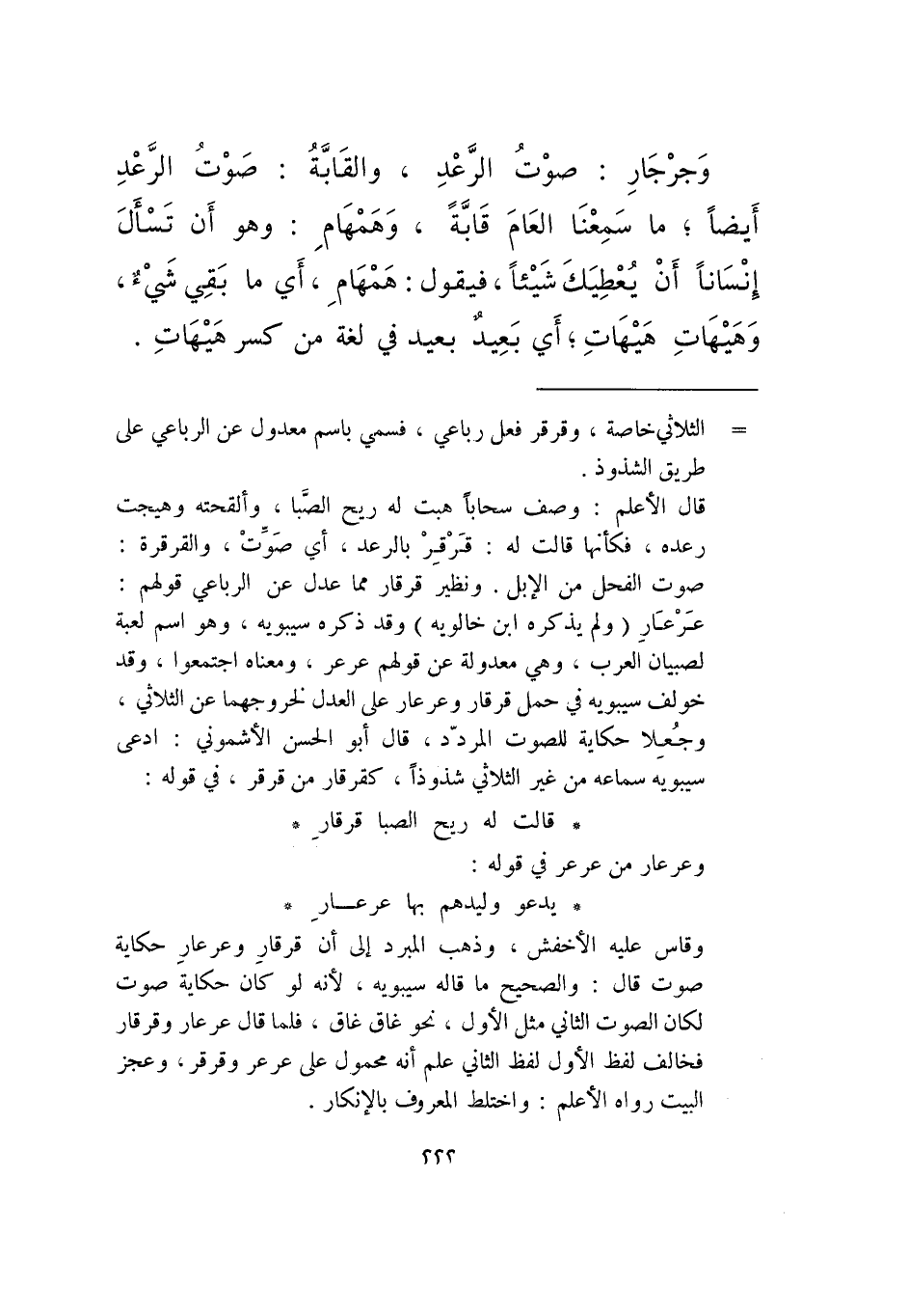 وجرجار: صوت الرعد، والقابة: صوت الرعد أيضًا؛ ما سمعنا العام قابة، وهمهام: وهو أن تسأل إنسانا أن يعطيك شيئا، فيقول: همهام، أي ما بقي شيء، وهيهاتِ هيهاتِ؛ أي بعيد بعيد في لغة من كسر هيهات.