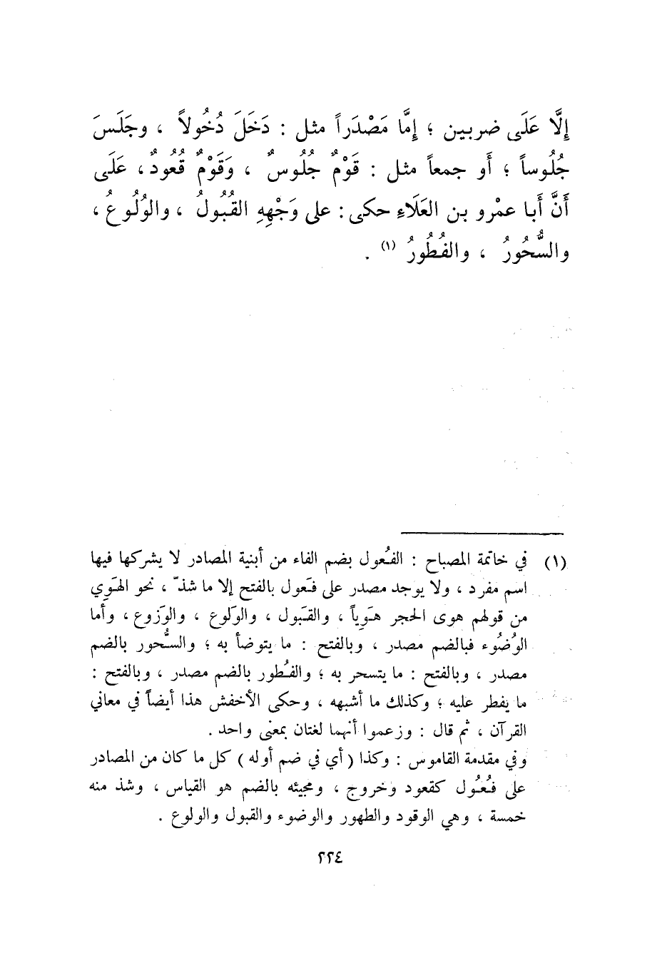 إلا على ضربين؛ إما مصدرا مثل: دخل دخولا، وجلس جلوسا، أو جمعا مثل: قوم جلوس، وقوم قعود، على أن أبا عمرو بنا لعلاء حكى: على وجهه القبول، والولوع، والسحور، والفطور.