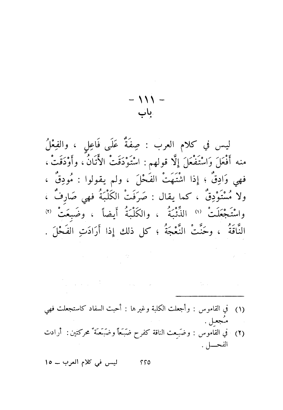 ليس في كلام العرب: صفة على فاعل، والفعل منه أفعل واستفعل إلا قولهم: استودقت الأتان، وأوْدَقت فهي وادِقٌ، إذا اشتهت الفحل، ولم يقولواك مُودِقٌ، ولا مستودِق، كما يقال: صرفت الكلبة فهي صارِف، واستجعلت الذئبة، والكلبة أيضا، وضبعت الناقة، وحنت النعجة، كل ذلك إذا أرادت الفحل.