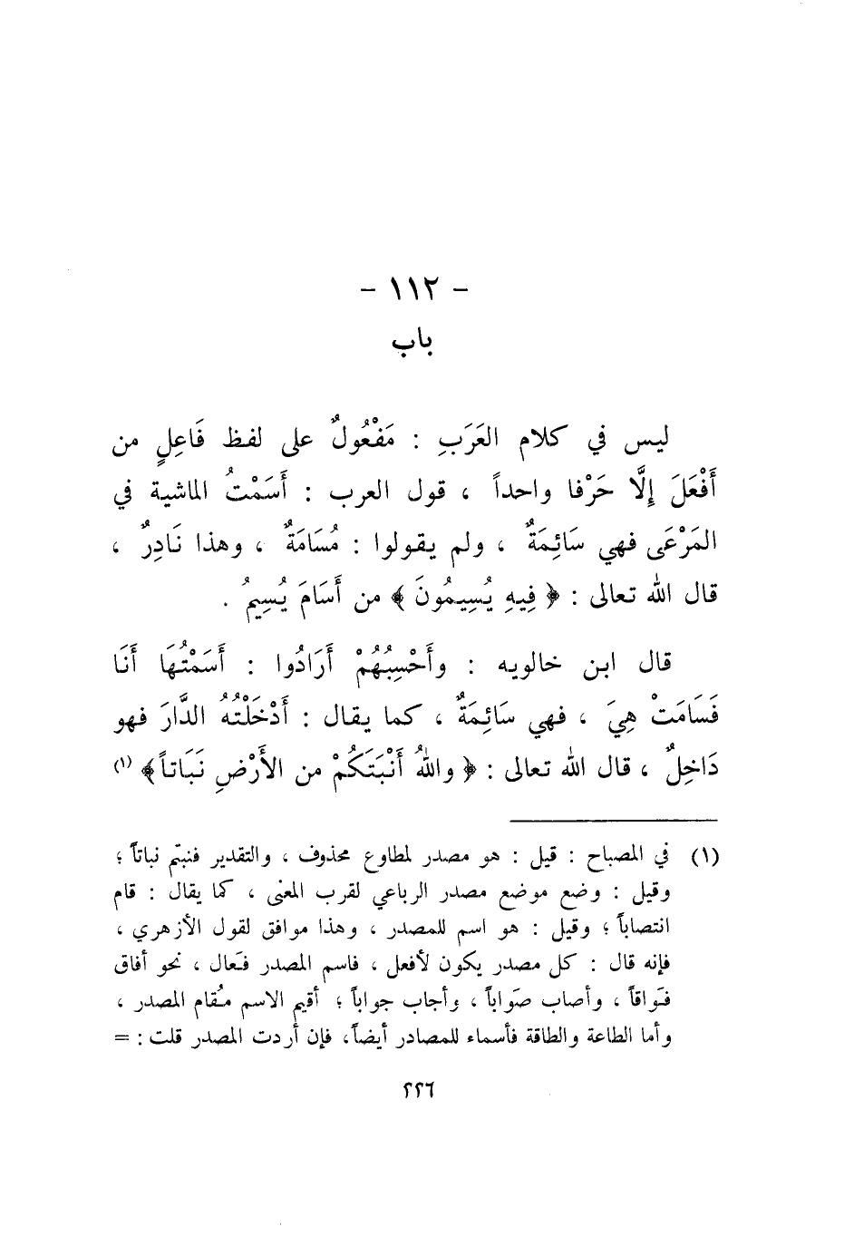 ليس في كلام العرب: مفعول على لفظ فاعل من أفعل إلا حرفا واحدا، قول العرب: أسمت الماشية في المرعى فهي سائمة، ولم يقولوا: مُسامة، وهذا نادر، قال الله تعالى: (فيه يسيمون) من أسام يسم.