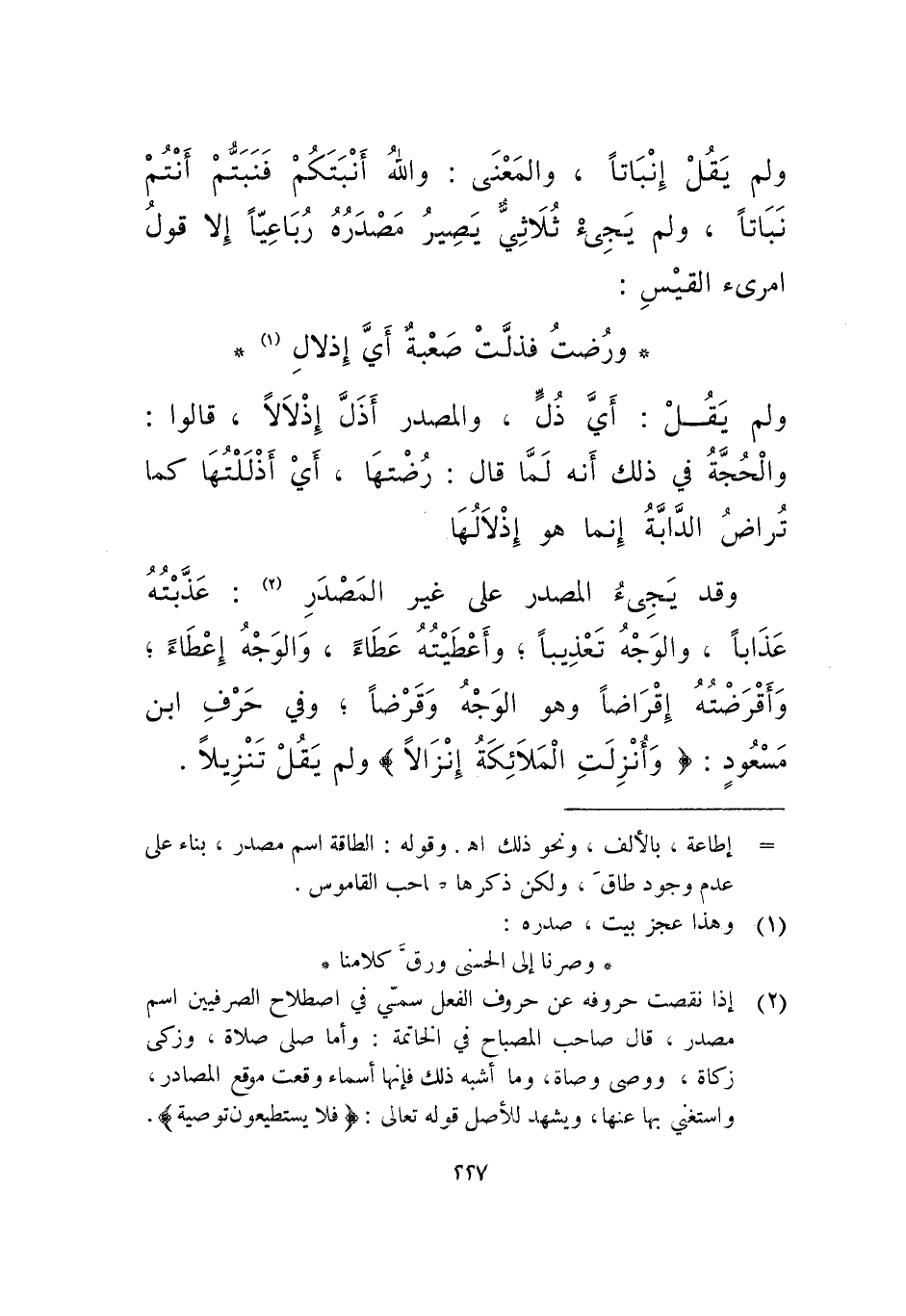 وقد يجئ المصدر على غير المصدر، عذبته عذابا، والوجه تعذيبا، وأعطيته عطاء، والوجه إعطاء، وأقرضته إقراضا وهو الوجه وقرضا، وفي الحرف ابن مسعود: (وأُنزِلتِ الملائكة إنزالا) ولم تنزيلا.