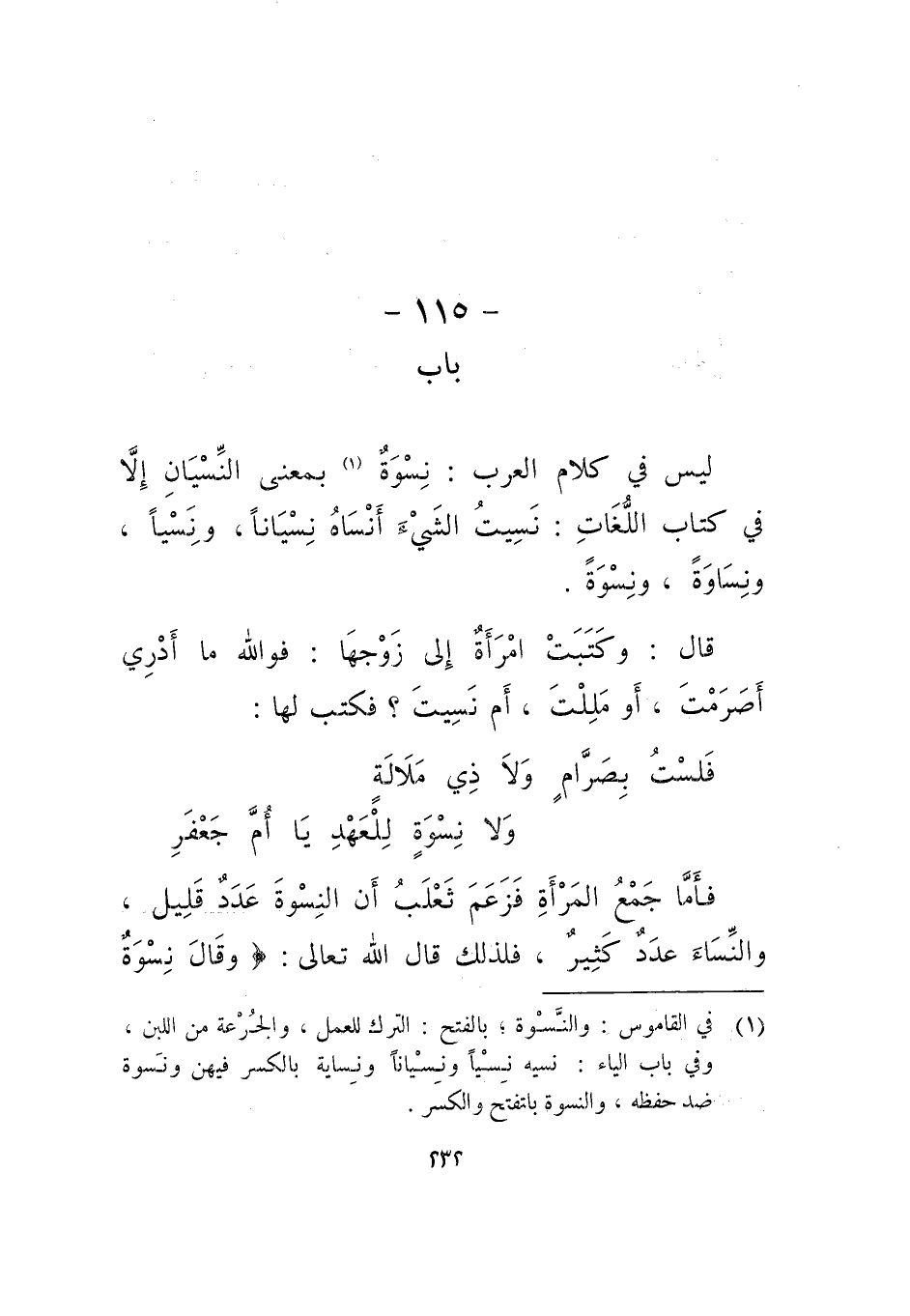 ليس في كلام العرب: نسوة بمعنى النسيان إلا في كتاب اللغات: نسيت الشيء أنساه نسيانا، ونسيا ونساوة، ونسوة.