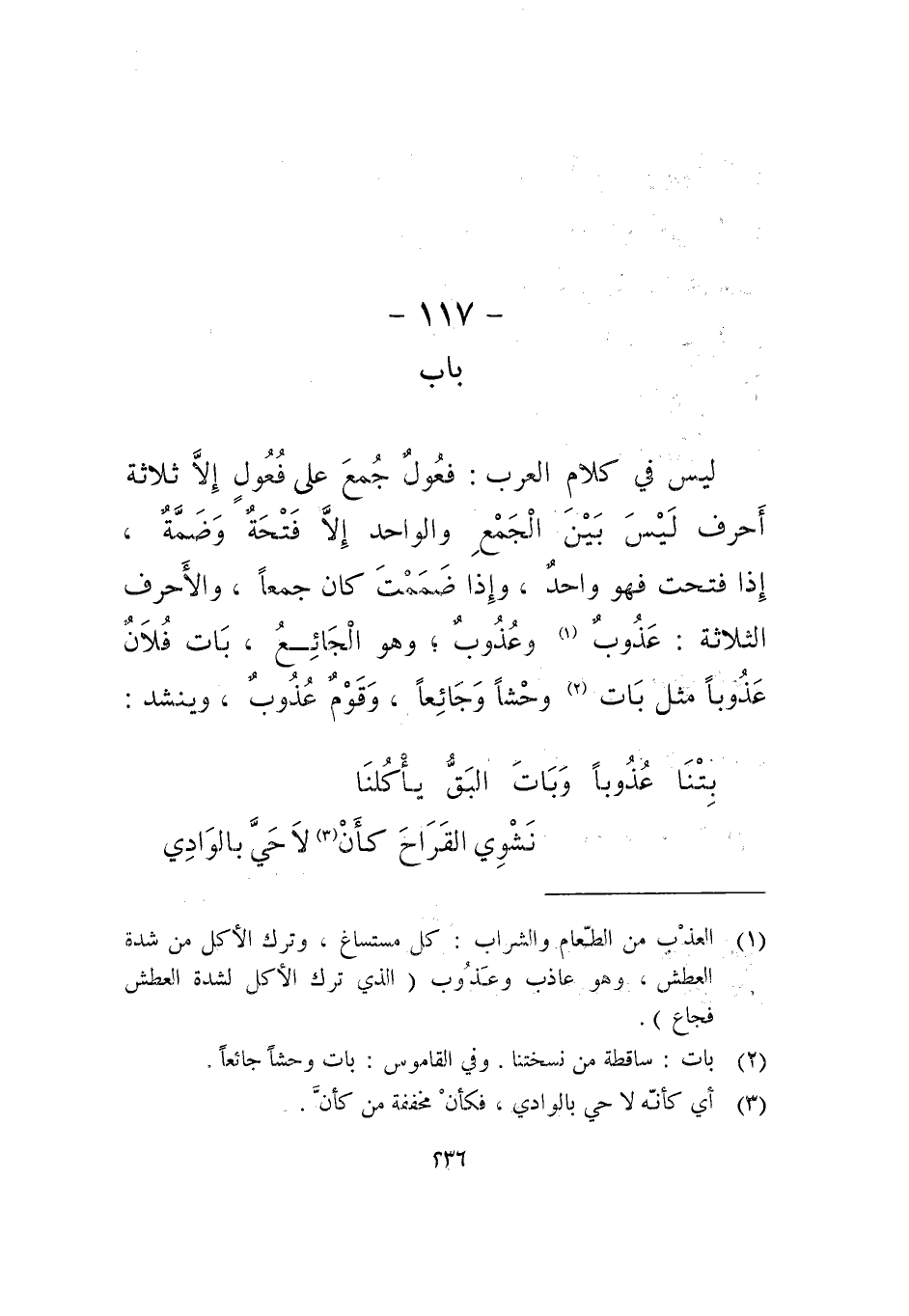 ليس في كلام العرب: فعُول جمع على فُعُولٍ إلا ثلاثة أحرف ليس بين الجمع والواحد إلا فتحة وضمة، إذا فتحت فهو واحد، وإذا ضممت كان جمعا، والأحرف الثلاثة: عذوب، وهو الجائع، بات فلان عذوبا مثل بات وحشا وجائعا، وقوم عذوب، وينشد: