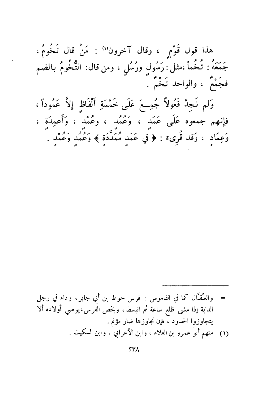 هذا قول قومٍ، وقال آخرون: من قال تَخُومُ، جمعه: تخمًا، مثل: رسول ورسل، ومن قال: التُّخُوم بالضم فجمع، والواحد تَخْم.