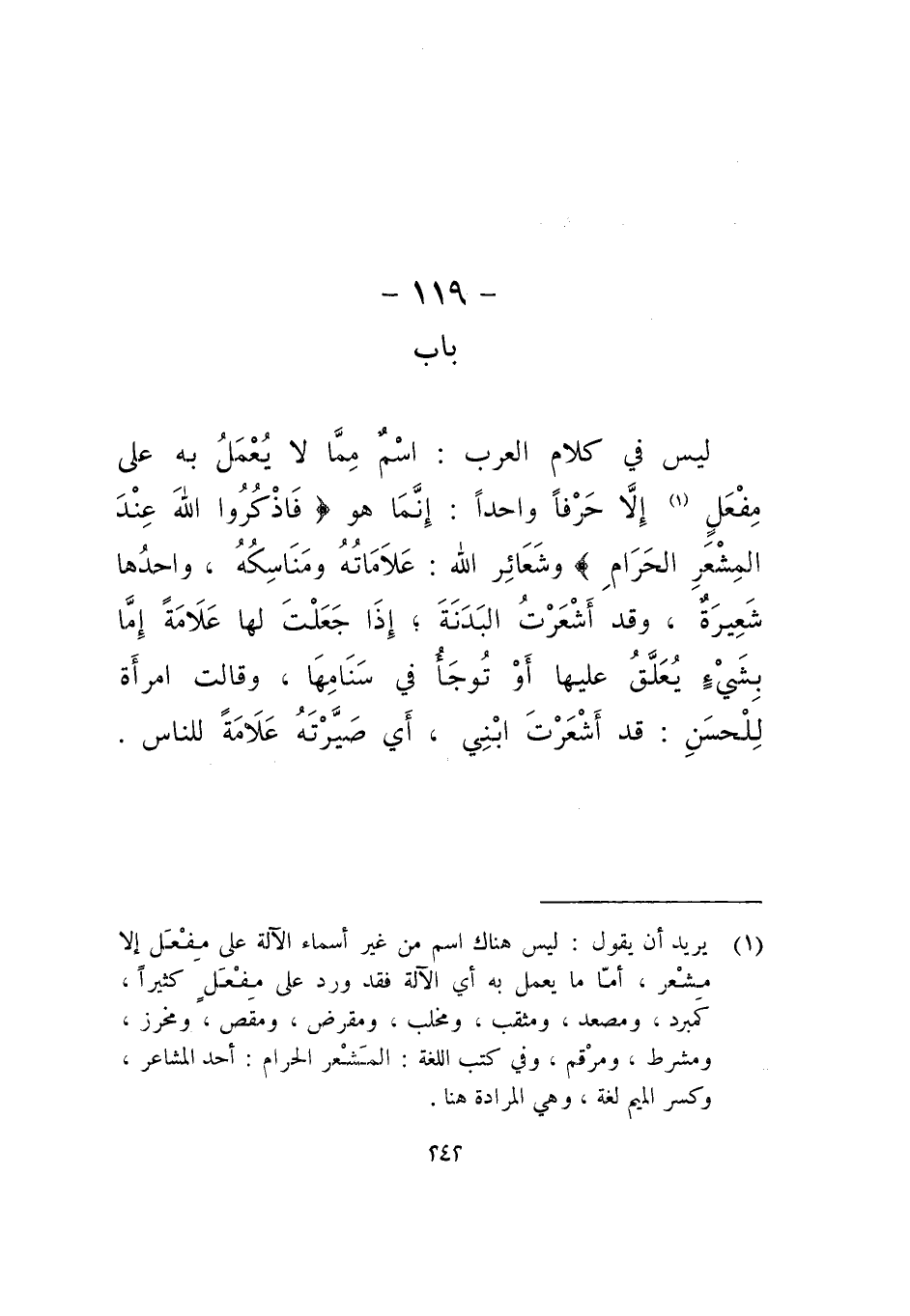 ليس في كلام العرب: اسم مما لا يعْمَل به على مِفْعَلٍ إلا حرفا واحدا: إنما هو (فاذكروا الله عند المشعر الحرام) وشعائر الله: علاماته ومناسكه، واحدها شعيرة، وقد أشعرت البدنة، إذا جعلت لها علامة إما بشيء يعلق عليها أو توجأ في سنامها، وقالت امرأة للحسن: قد أشعرت ابني، أي صيرته علامة للناس.