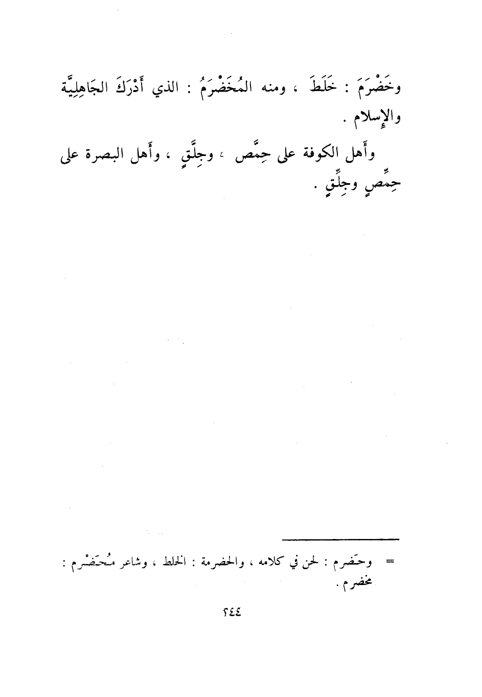 وخضرم: خلط، ومنه المخضرم، الذي أدرك الجاهلية والإسلام.