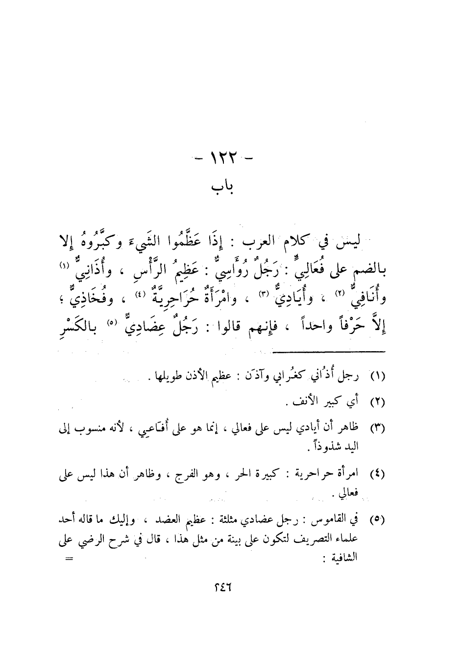 ليس في كلام العرب: إذا عظموا الشيء وكبروه إلا بالضم على فعالي: رجل رُوأسي: عظيم الرأس، وأذاني وأنافي، وأيادي، وامرأة حراحرية، وفخاذي، إلا حرفا واحدا، فإنهم قالوا: رجل عضادي بالكسر