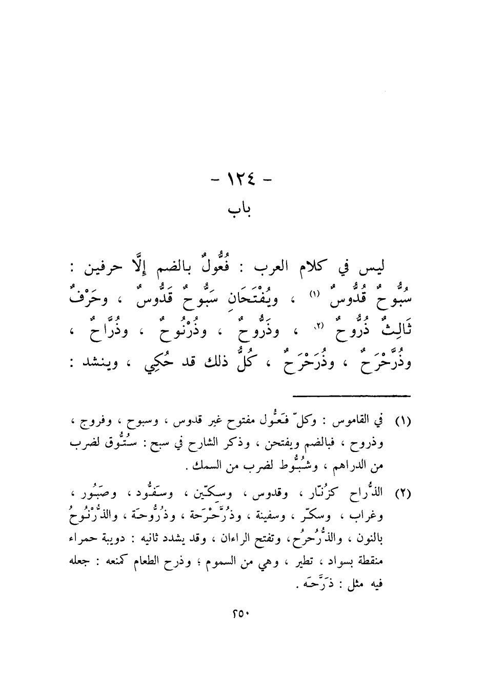 ليس في كلام العرب: فعول بالضم إلا حرفين: سبوح قدوس، ويفتحان سبوح قدوس، وحرف ثالث ذُرُّوح، وذَروح، وذرنوح، وذراح، وذرَّحرح، وذرَحرح، كل ذلك قد حكي، وينشد: