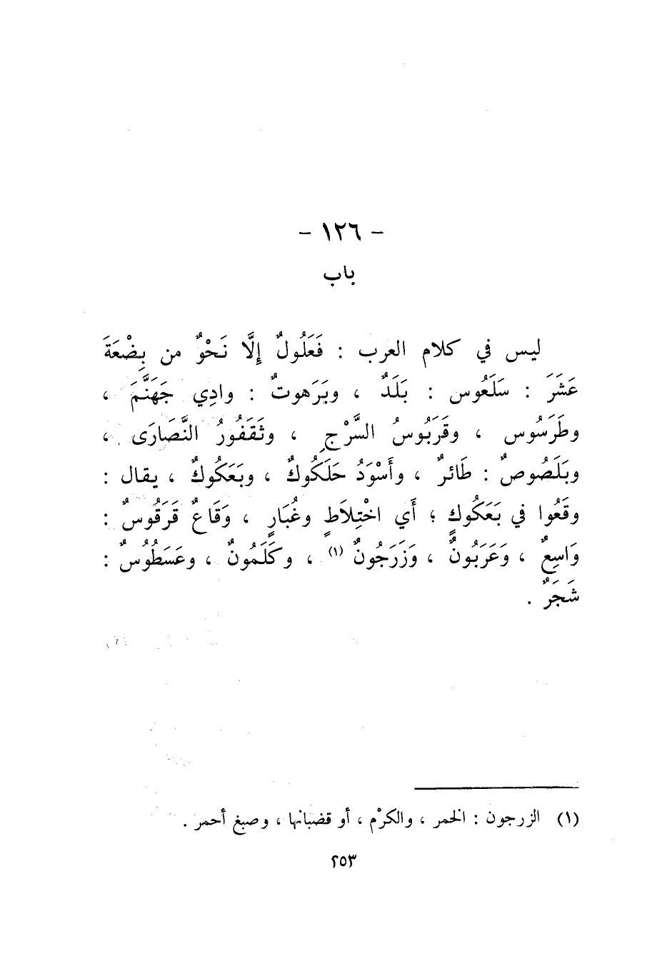 ليس في كلام العرب: فَعَلُولٌ إلا نحو من بضعة عشر: سلعوس: بلد، وبرهوت: وادي جهنم، وطرسوس، وقربوس السرج، وثقفور النصارى، وبلصوص: طائر، وأسود حلكوك، وبعكوك، يقال: وقعوا في بعكوك، أي اختلاط وغبار، وقاع قرقوس: واسع وعربون، وزرجون، وكلمون، وعسطوس: شجر.