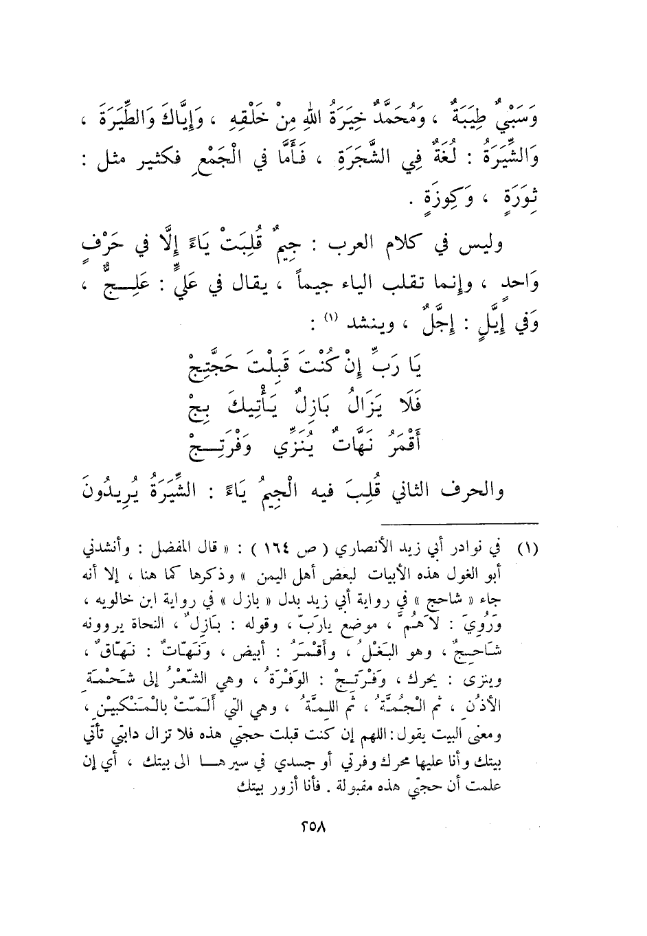 وسبي طيبة، ومحمد خيرة الله من خلقه، وإياك والطيرة، والشيرة: لغة في الشجر، فأما في الجمع فكثير مثل: ثِورة، وكوزة.