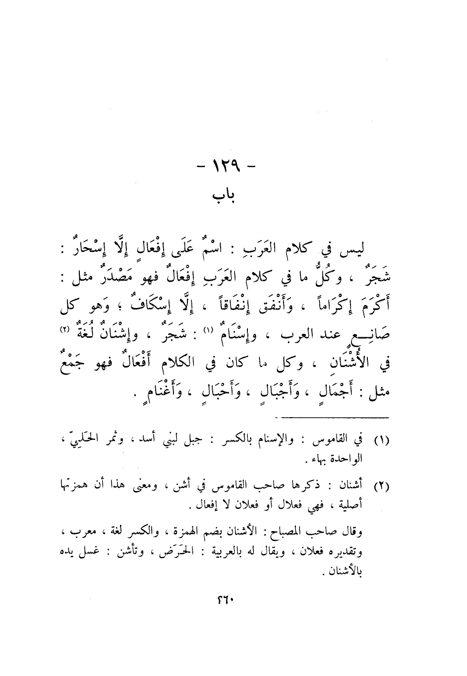 ليس في كلام العرب: اسم على إفعال إلا إسحار: شجر، وكل ما في كلام العرب إفعال فهو مصدر مثل: أكرم إكراما، وأنفق إنفاقا، إلا إسكاف، وهو كل صانع عند العرب، وإسنام: شجر، وإشنان لغة في الأشنان، وكل ما كان في الكلام أفعال فهو جمع مثل: أجمال، وأجبال، وأحبال، وأغنام.